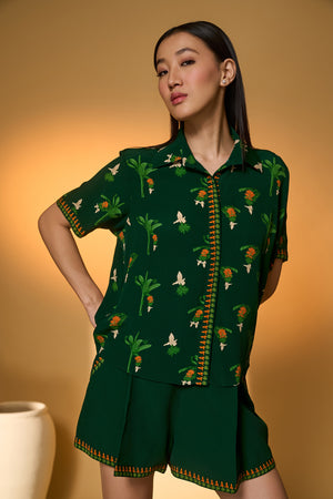 Details: Shirt – The shirt has an all-over print | finished with a border on the sleeves and placket. Shorts – The shorts are made in Viscose Crepe | zipper closure | side pockets | finished with a tropical border.