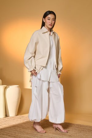Details: Jacket- Relaxed | Double-layered front |Elasticated under-layer | Centre-front zipper closure with tassel detail | 'Pine-code' embroidered at the back, adorned with tonal crystal droplets | Balloon Sleeves