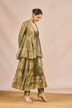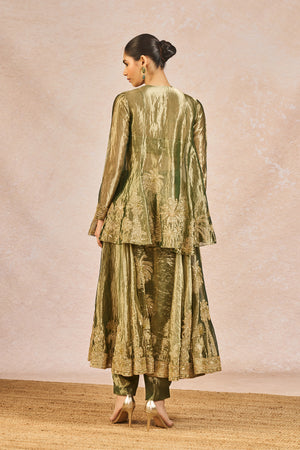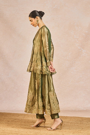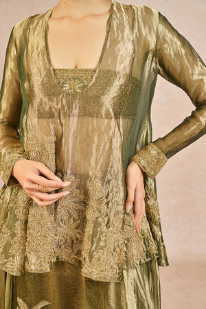 Description: The ‘KHWABON KI SHEHZADI’ SKD SET is a stunning display of refined elegance and intricate craftsmanship. Entirely crafted from delicate tissue fabric, the ensemble is richly adorned with detailed gold embroidery including the ' Gul Jharokha' motifs repeated in a rhythmic circular repeat, adding a layer of texture and opulence. The set includes a sheer kurta, a structured tube top, a skirt, and tailored pants—each piece thoughtfully designed to create a harmonious and glamorous silhouette. The interplay of fluid layers and metallic detailing makes this set a perfect blend of tradition and contemporary flair.