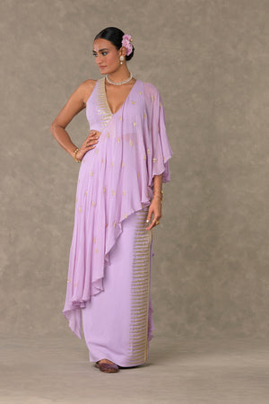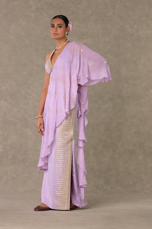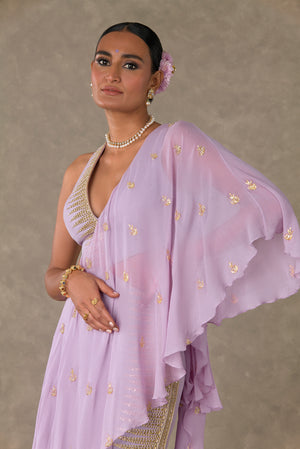 Details: Lilac Trikone Saree - Cut out gown with attached embroidered ruffled palla | Trikone embroidered neckline and front in dori, sitara and moti kaam |'V' Neck | In-cut sleeves | Centre back closure