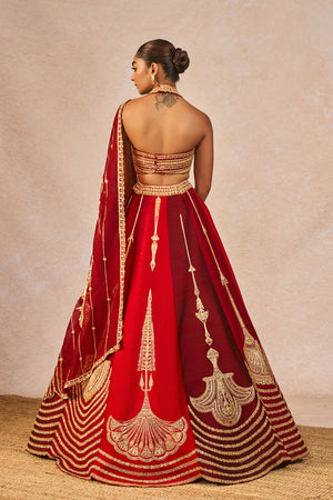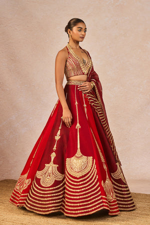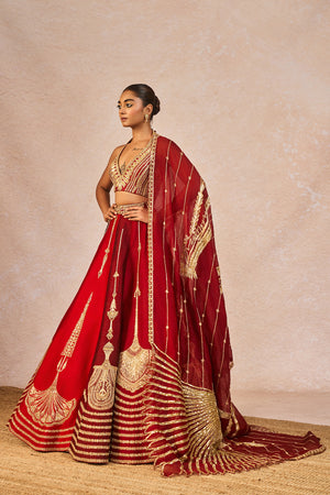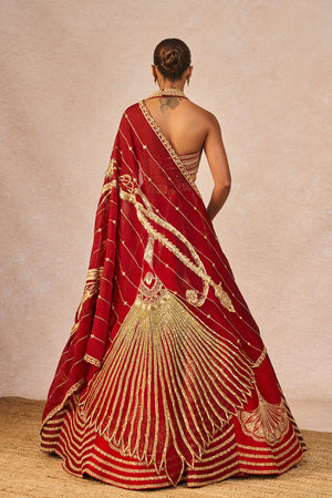 Details: The 'Milan Ki Aas' Lehenga Set- Lehenga intricately embroidered with 'Pankha' motifs in a linear pattern |Striped scallop embroidery along the hem | 12 Kalis | Side Seam zipper closure | Side pockets | Comes with a separate Can Can skirt. Blouse- Halter neckline | Open back detail | Centre back closure. Dupatta - Red organza dupatta with enlarged 'Pankha' motif placement along the hem | Delicate embroidered stripes and buttis all over.