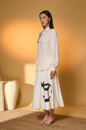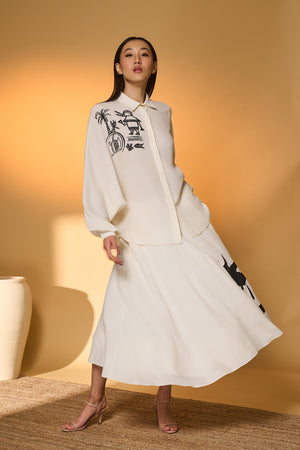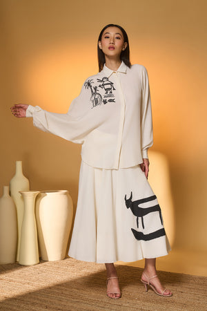 Details: Shirt- One side Batwing sleeves | Front closure | Turtle dream placement print on the right shoulder Skirt- A circular swing skirt |Placement screen printed "Moo Meadow" | Side zipper