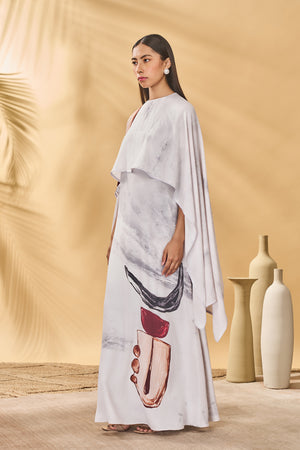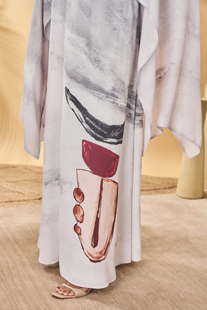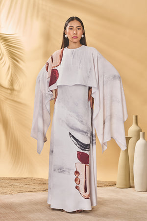 Details: Cape kaftan | High low cape with ladder lace detail | Side slits | Moon & Mist placement on cape and body | back neck opening