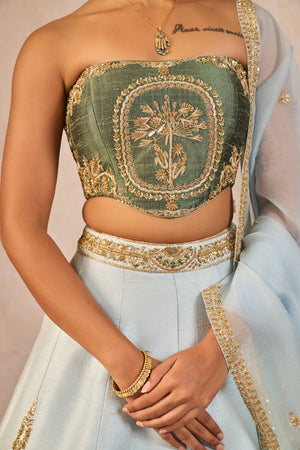Details: The 'Pehli Baarish' Lehenga Set- Lehenga intricately embroidered on asymmetrical abstract patchwork with 'Bagh' motifs in a linear pattern | 12 Kalis | Side Seam zipper closure | Side pockets | Comes with a separate Can Can skirt. Blouse- Strapless | Embroiderd Corset Body | Open back with tie-up detail | Centre back closure. Dupatta - Sheer green organza with light blue Patchwork Dupatta with enlarged 'Pankha' motif placement on the corners | Delicate linear 'bagh' motifs embroidered all over.