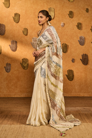 Details: This ivory saree in luxurious raw silk features a striking half-and-half layout with foil print in rich gold. The pallu is highlighted with a vibrant multicolored lampi panel, adding festive brilliance and texture to the drape. It is paired with a halter gota blouse featuring delicate foil detailing and a plunge neckline—perfect for a bold yet elegant look.