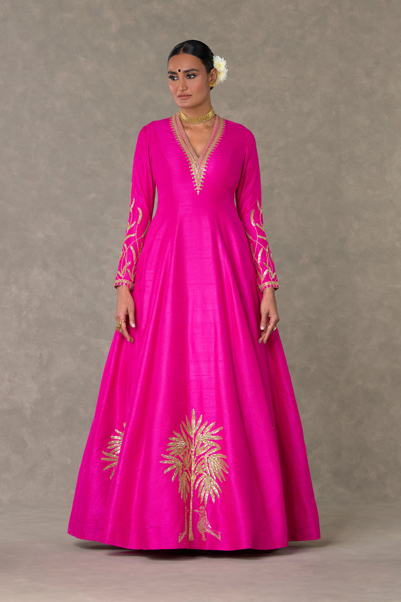 Details: Rani Pink Shajara Gown - This Gown with 'V' neckline embellished with dori and sitara kaam | Full sleeves embellished with jhaal and edged with kinari | Hem embellished with Shajara motif and edged with kinari | Comes with attached Can Can | Center back closure