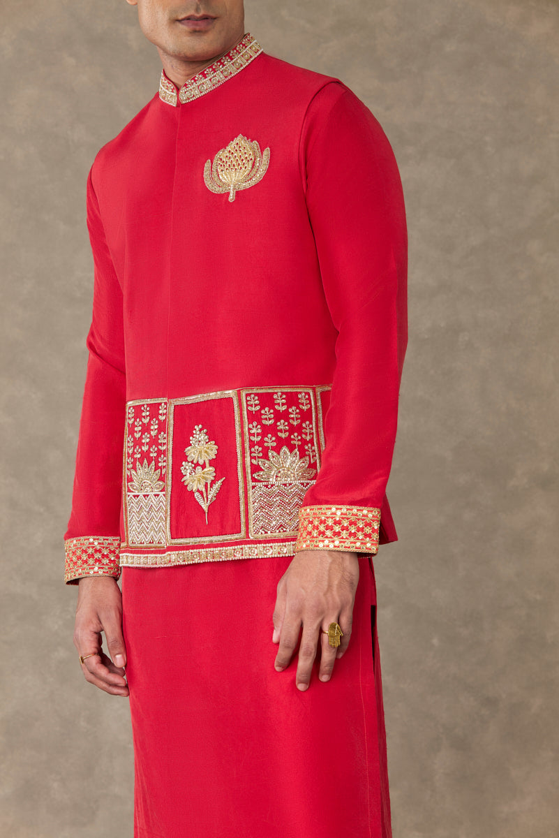 Details: Red Bandi Men - Adorned with Trikone embroidery with dori, sitara, dabka & moti kaam |Center front opening| Mandarin collar | Concealed placket