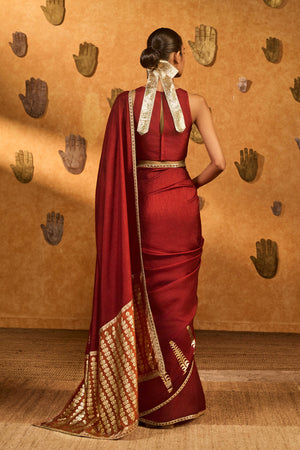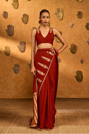 Details: Saree - The saree features placement foil prints all over, finished with an applique foil print at the end of the pallu, set against a rich rust raw silk base. Blouse - The blouse features a beautiful, embroidered motif on the collar, adding an elegant touch to the design.