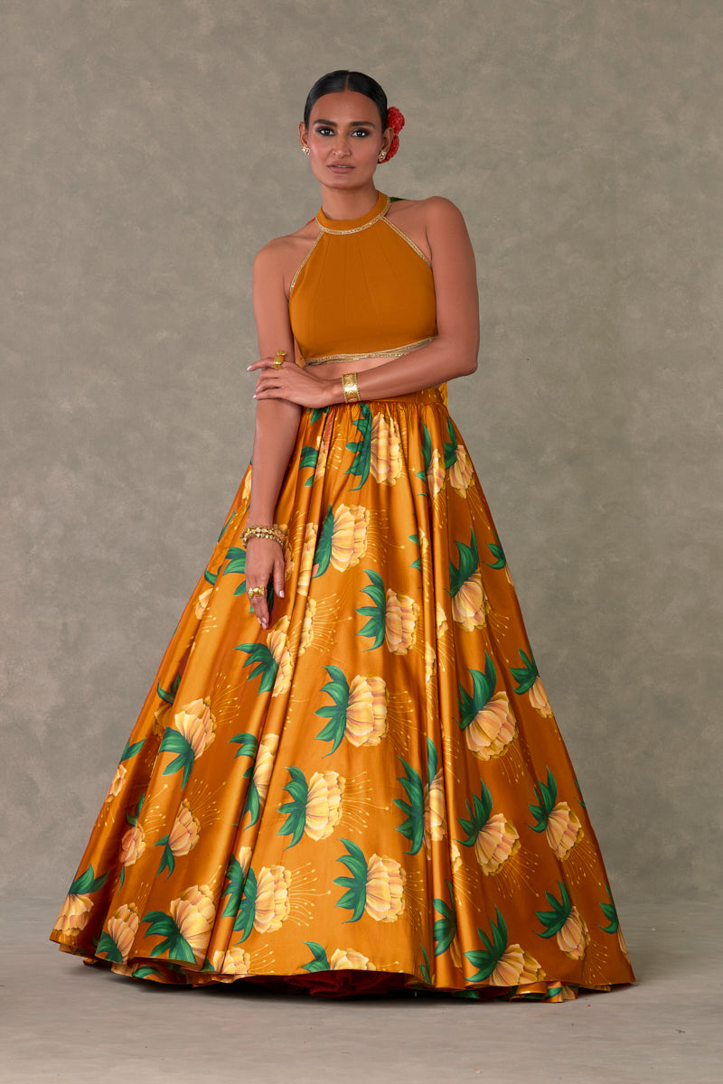Details: Rust Masakali Skirt Set - All over digital printed skirt |Circular skirt with light gathers around the waist | Side zip closure | Pocket detail |Comes with a separate can skirt. Busteir- Zero neckline bustier embellished with Sitara border | In-cut sleeves | Centre back closure with detachable organza drape