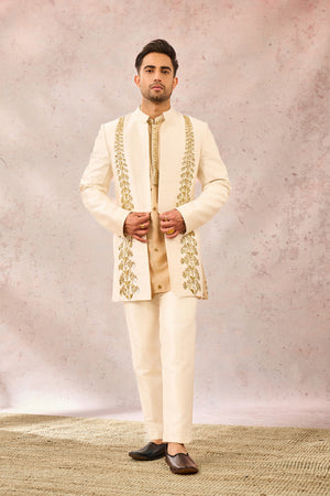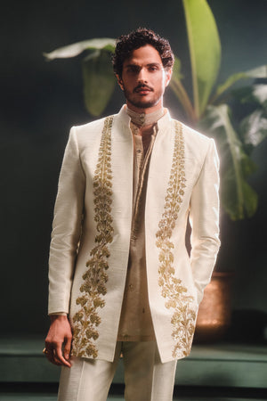 Details: Koti - Embellished with 'Berry Bel' motif in gold dori, sequins and cutdana embroidery | Full sleeves | Open Sherwani | Printed lining | Short length Pant - Front button and zip opening | Pockets Kurta - Embellished kurta with 'Berry Bel' motif in gold dori, sequins and cutdana embroidery| Embellished placket & collar