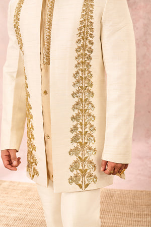 Description:The Kaju Katli Raja koti is an ornate ensemble, embelished with heavy gold embroidery of zardozi, katdana and pearl work inspired by 'Berry Bel'. This sherwani consists of a short georgette tissue kurta inside to add whimsy to the whole look and a pair of straight smart pants.