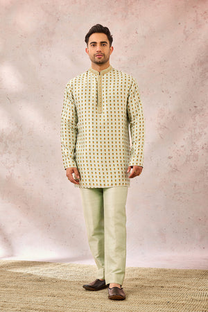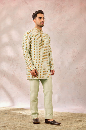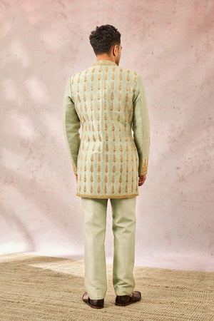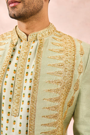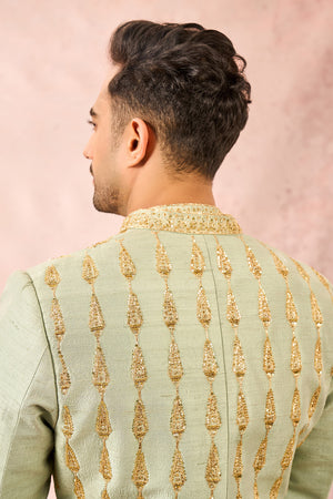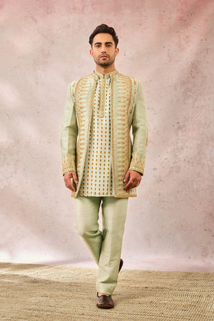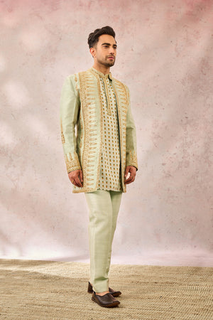 Description:Ornate gold embroidery comes to life in The Kashni Raja koti inspired by 'Amaltas'. In a relaxing hue of sage green and embelished with heavy gold work that consists of zardozi, katdana and pearl work. With a short kurta and smart pants- this Raja koti is fit for a king indeed.