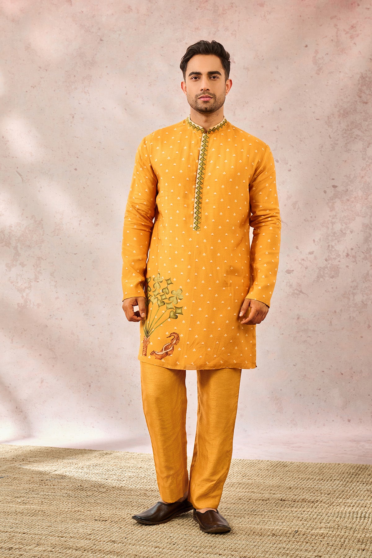 Details: Kurta- All over digital printed short kurta | Full sleeves |Mandarin collar | Concealed placket Pant- Straight pants with pocket