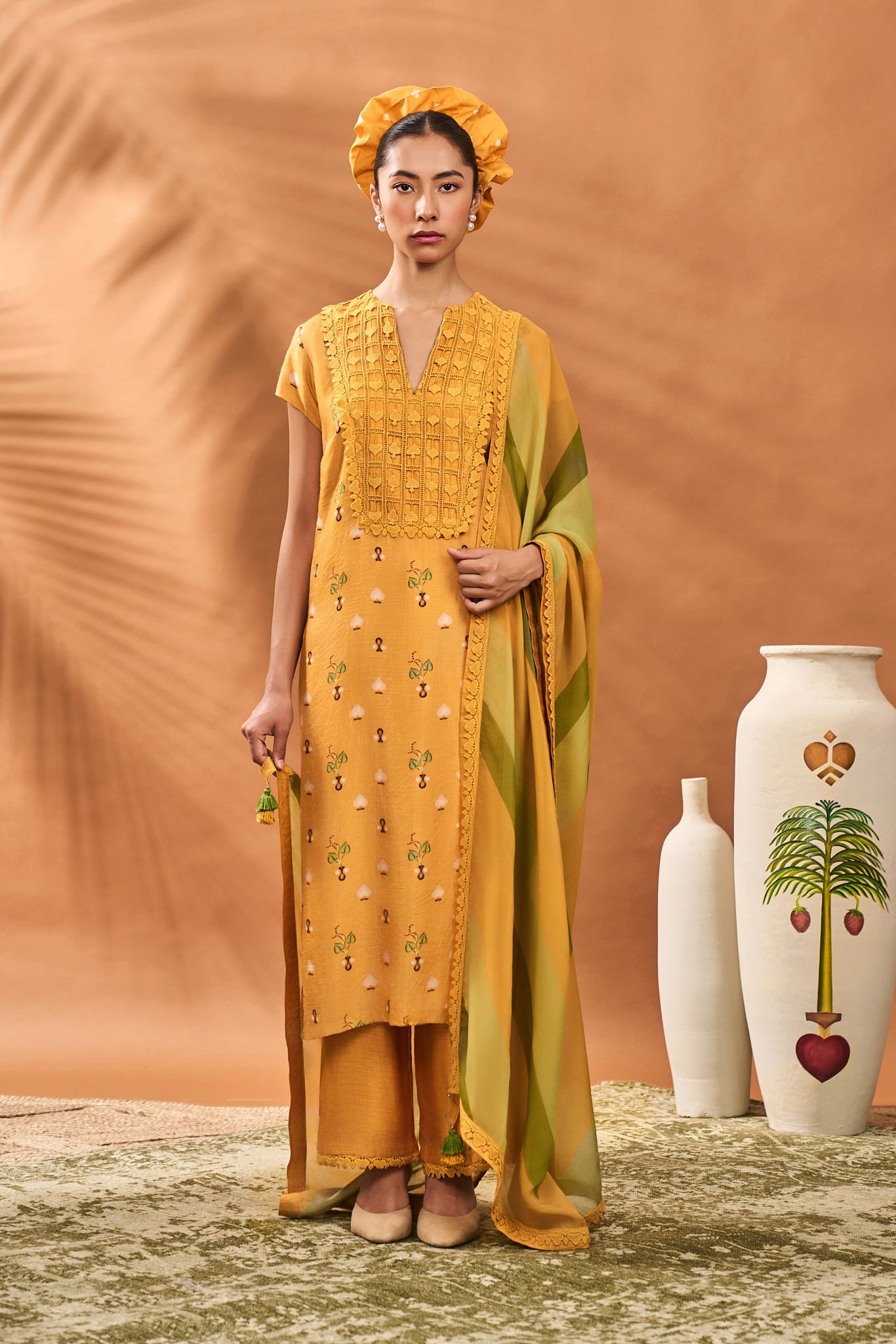 Styling: Pair this beautiful Kurta set with a pair of statement earrings and mojris. Style it with our beautiful organza dupatta draped elegantly over one shoulder for a more elevated look. Accessories it with a potli bag.