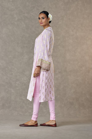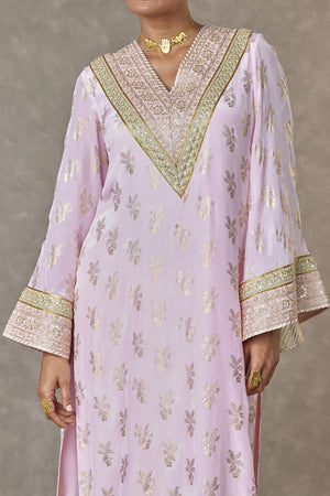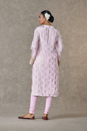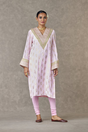 Details: Blush Cherrybloom Kurta - Embellished with embroidered borders | Outfit features bell sleeves and a 'V' neck | The kurta has a beautiful Cherrybloom print and comes with a pink legging