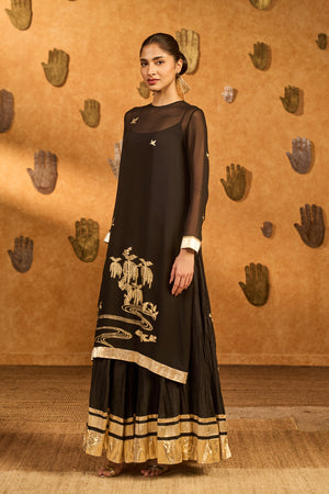 Details: Kurta- Straight kurta adorned with beautiful Stillwater Bloom placement foil print | Hem and sleeves embellished with lampi gota and gold lace | Center back opening Anarkali- Black crushed anarkali | Embellished with lampi gota at the hem | Adjustable straps