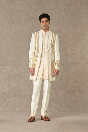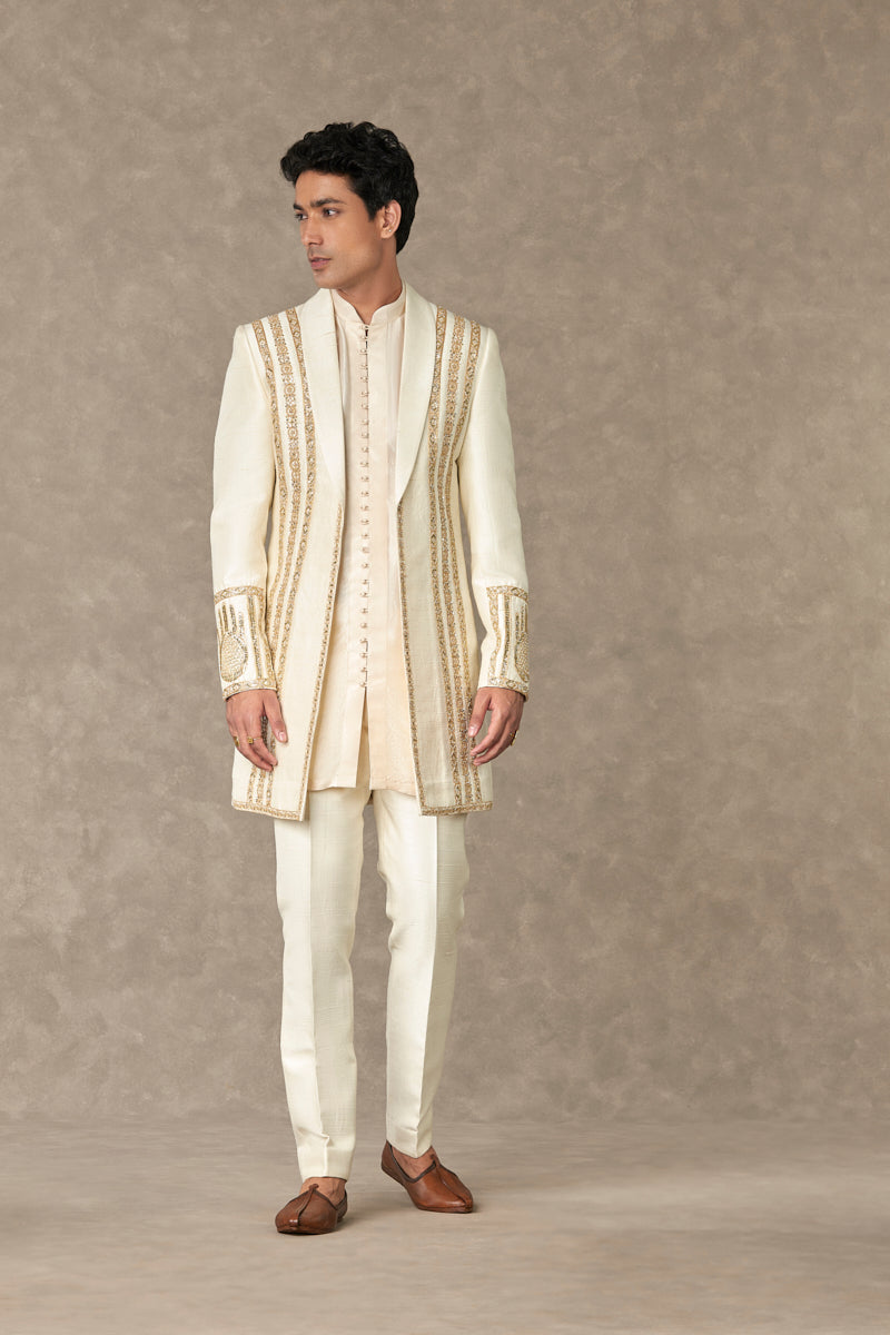 Styling: Style the classic raja koti with our button down Ivory Kurta for men, ankle pants and mojris