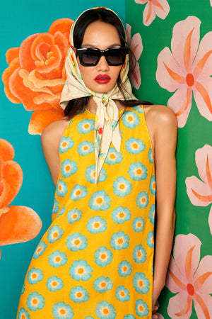 Details: Classic Yellow Crazy Daizy In-Cut Mini Dress - Halter Neck | Short Dress | Scallop Lace | Pockets