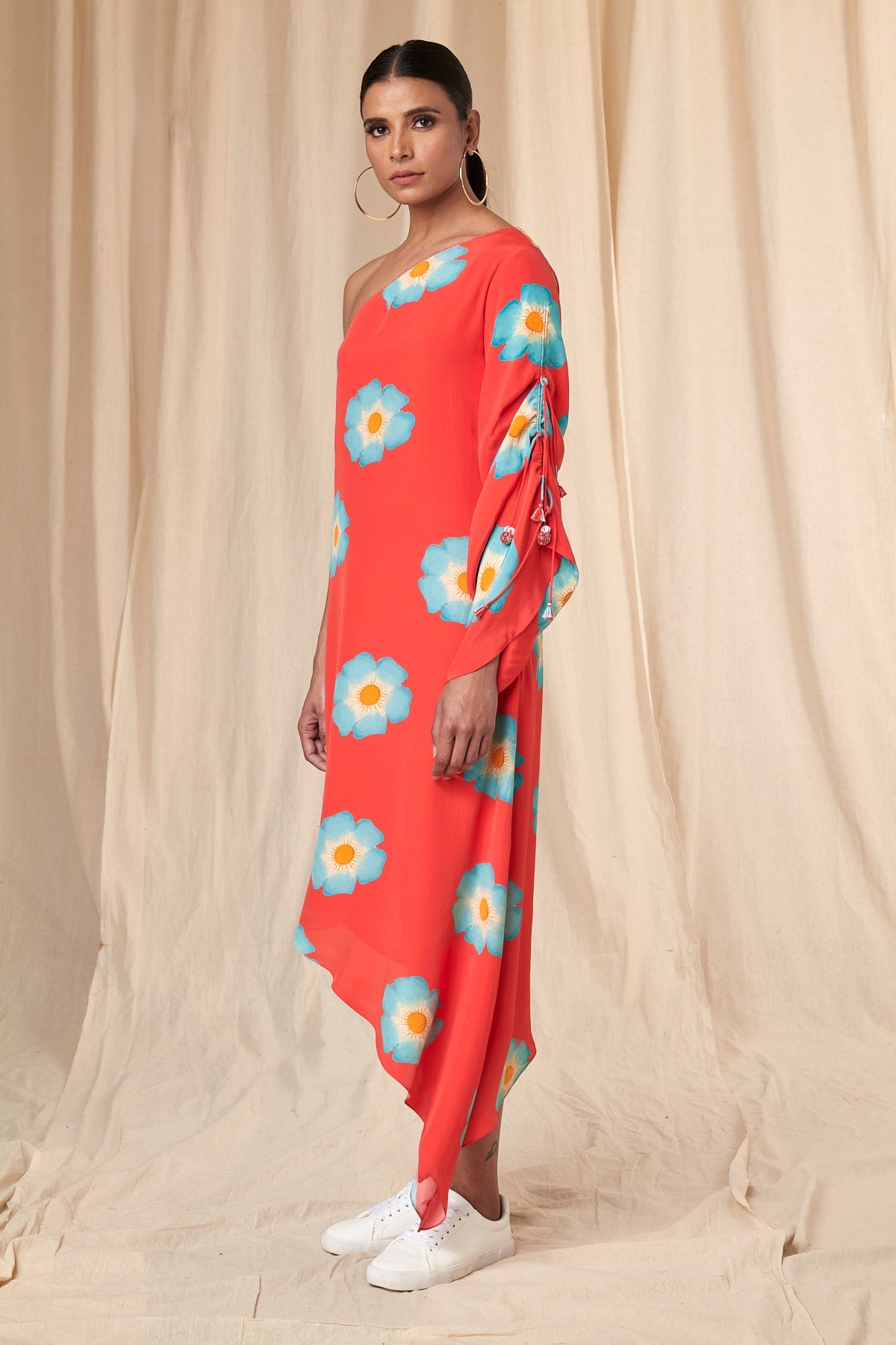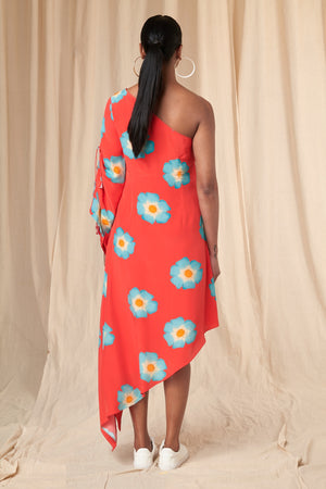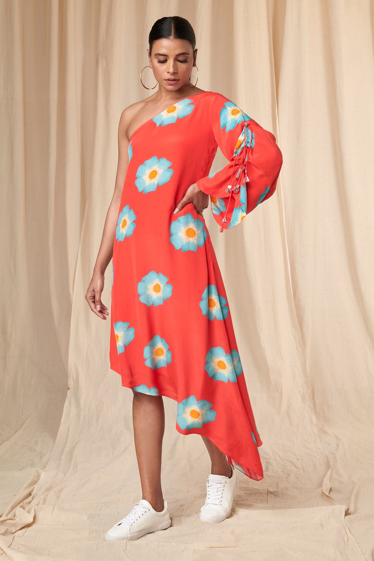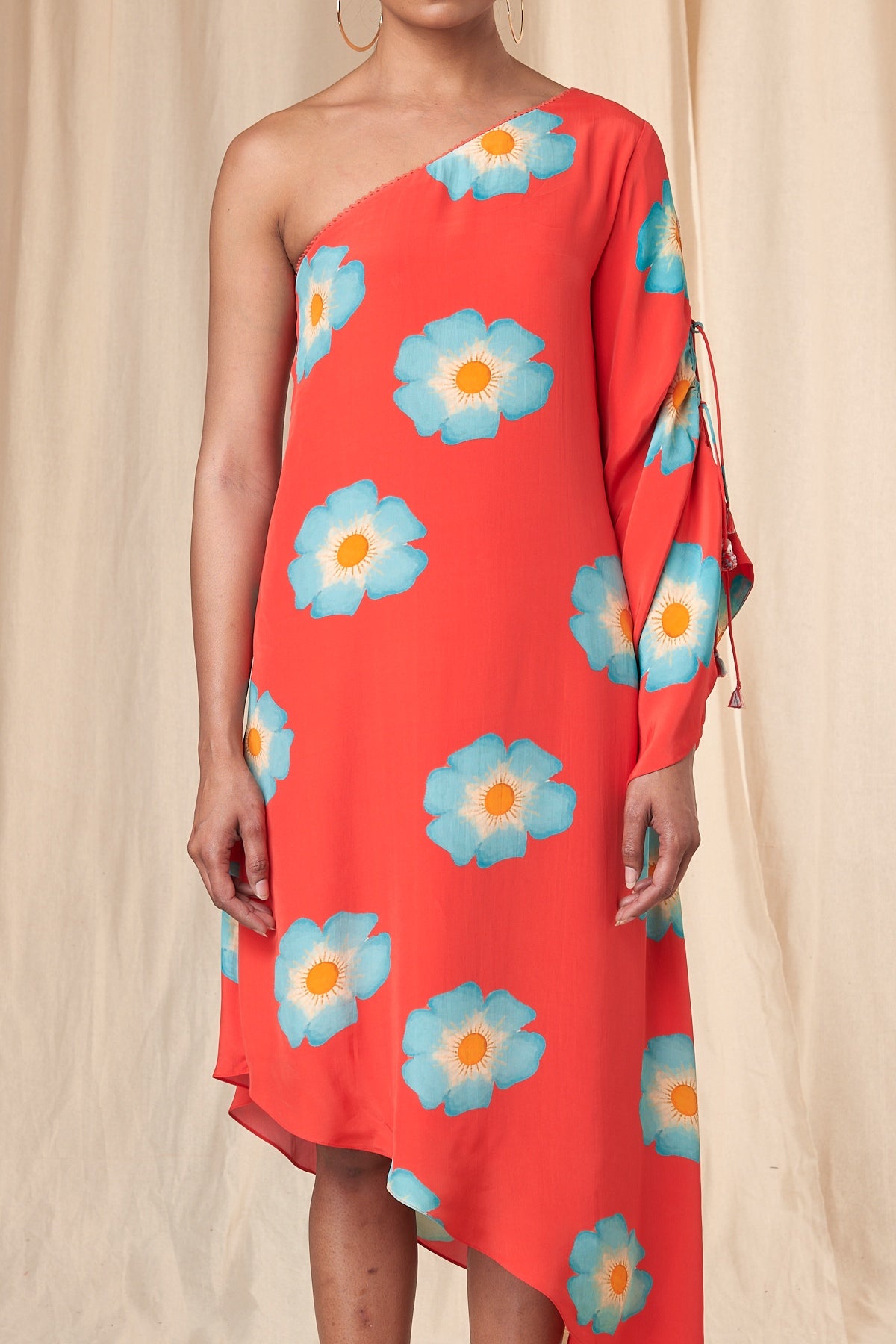 Details: Red Crazy Daizy One Shoulder Dress - One Shoulder | Synched Sleeves | Tassels