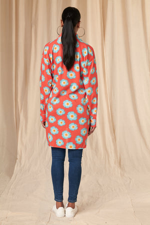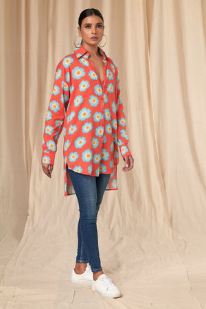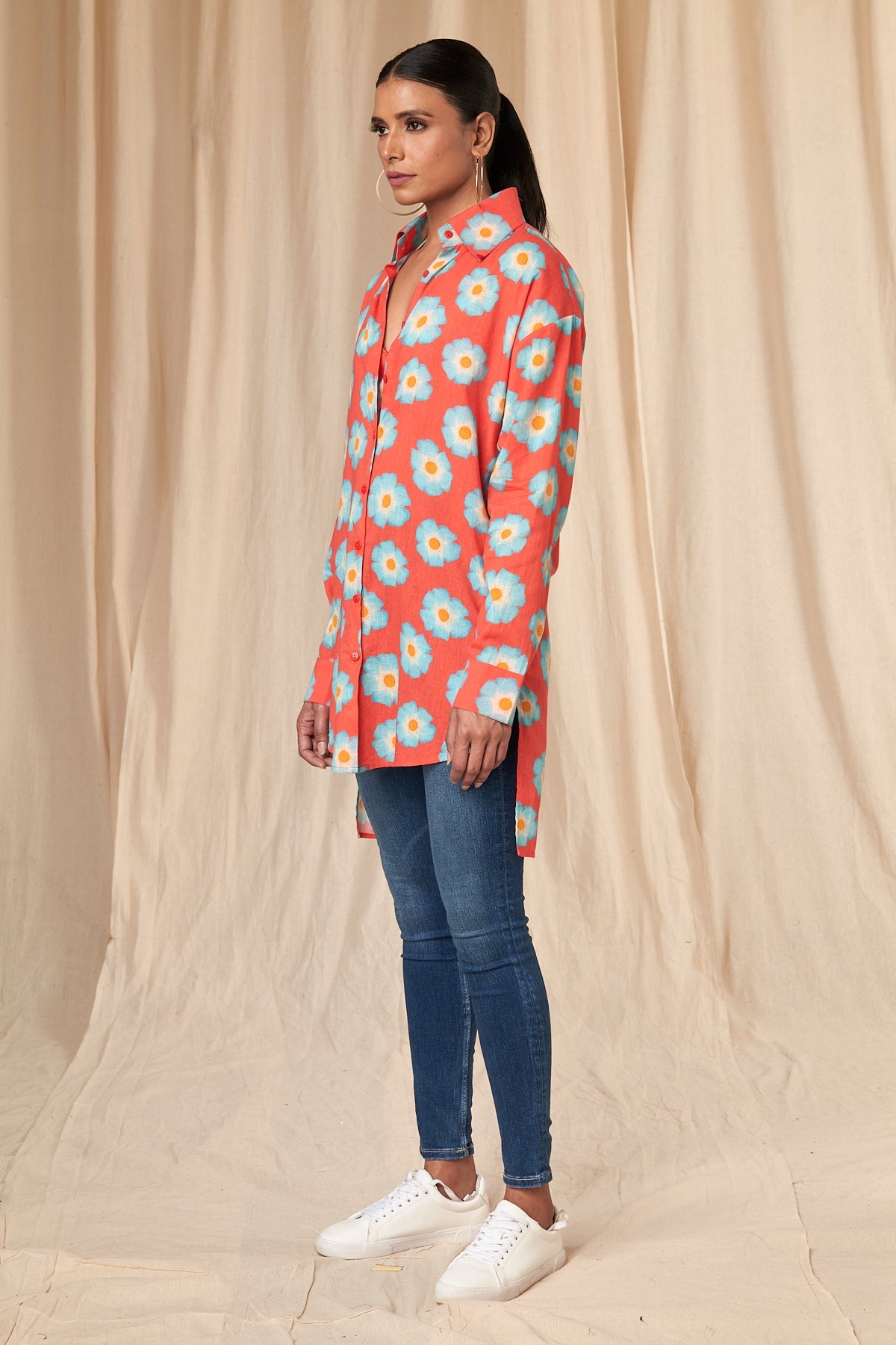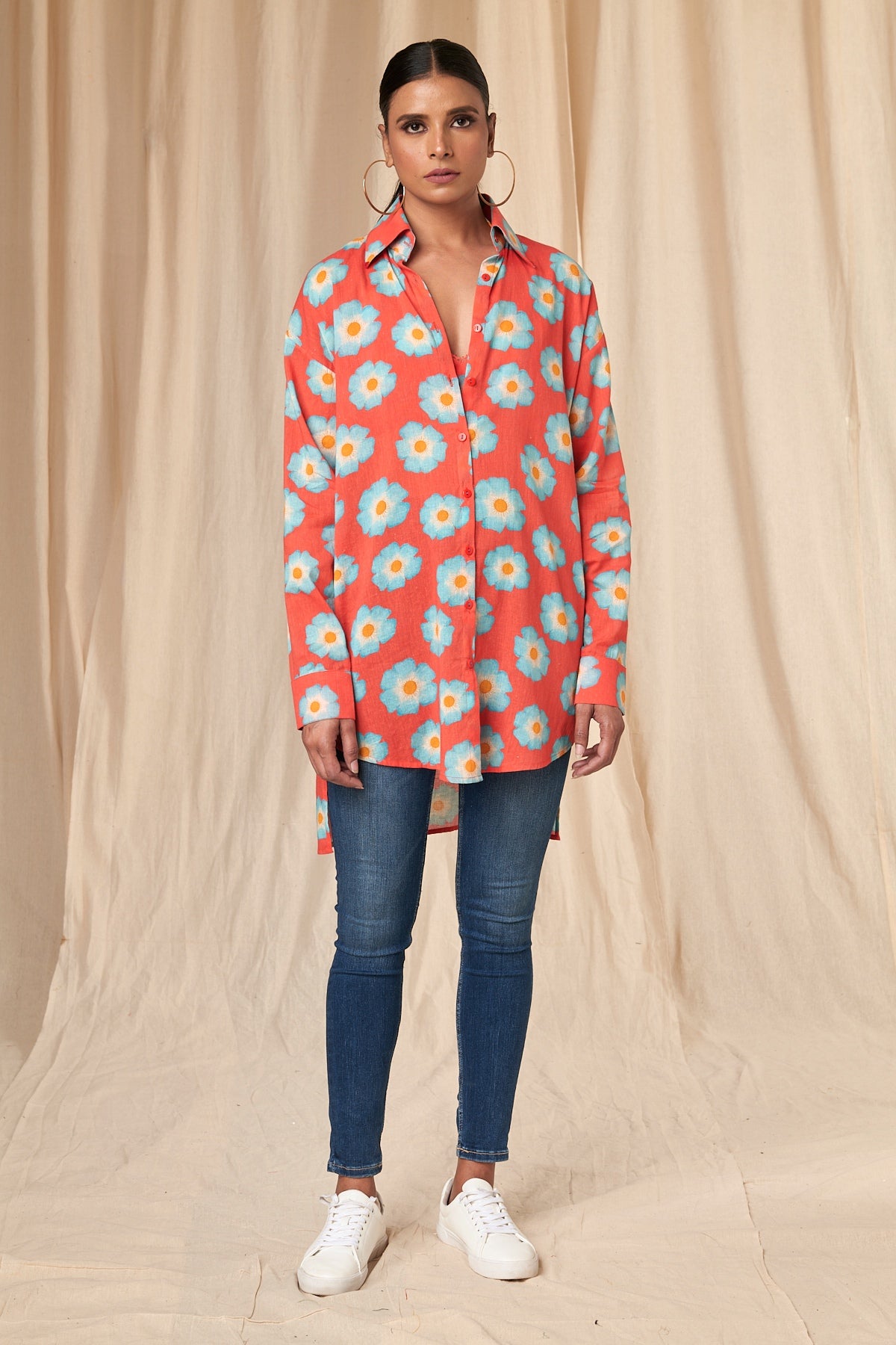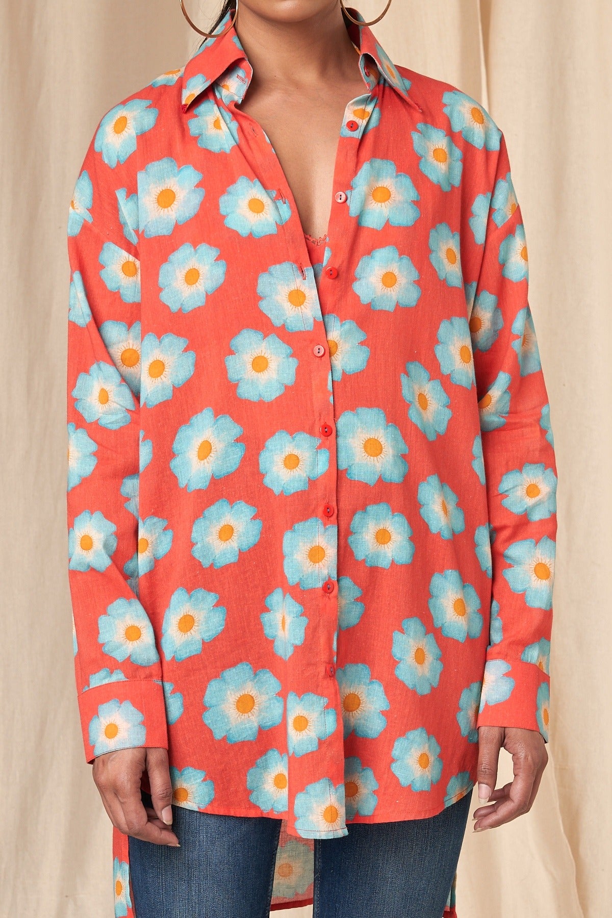 Details: Red Crazy Daizy Shirt - oversized | drop shoulder | curved hem | spread collar | bead work