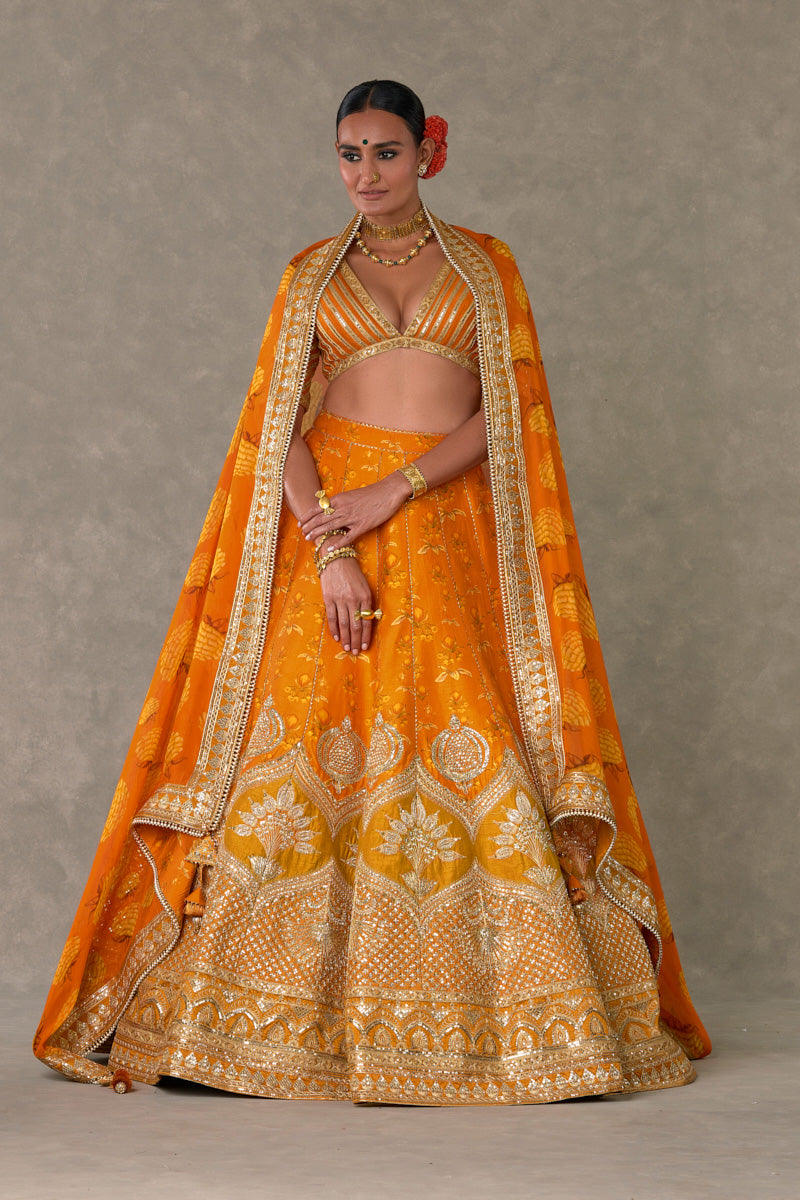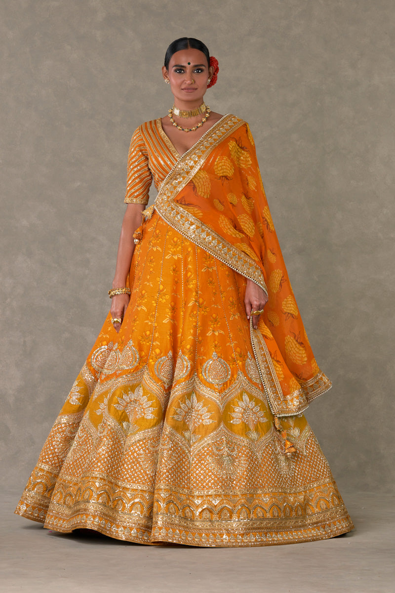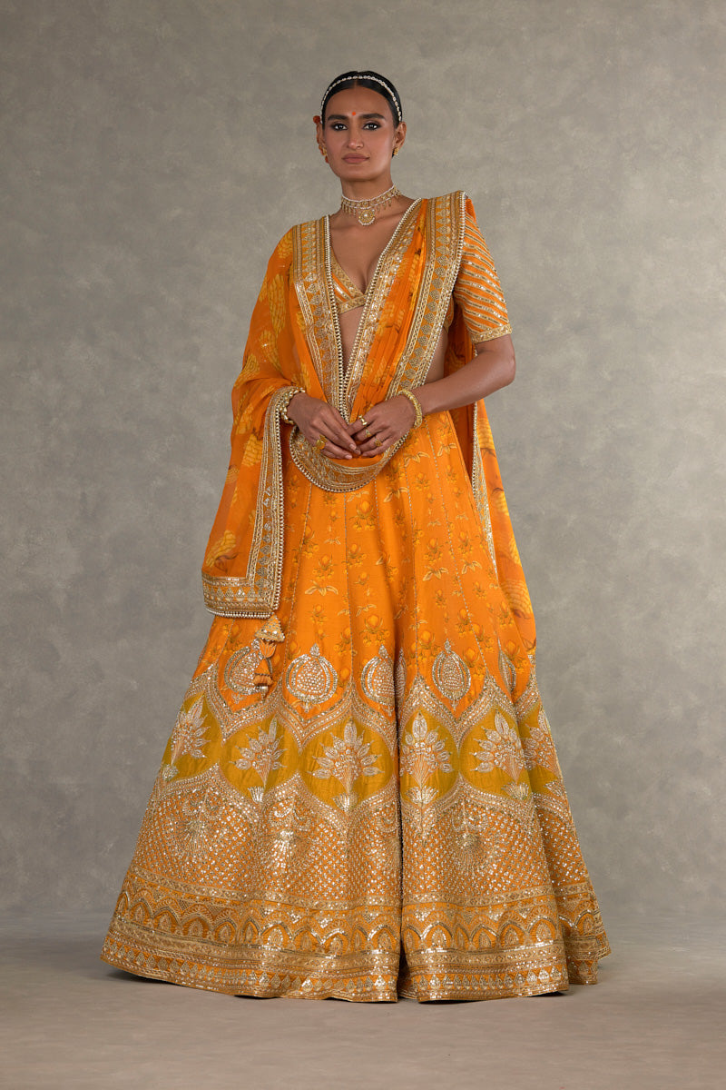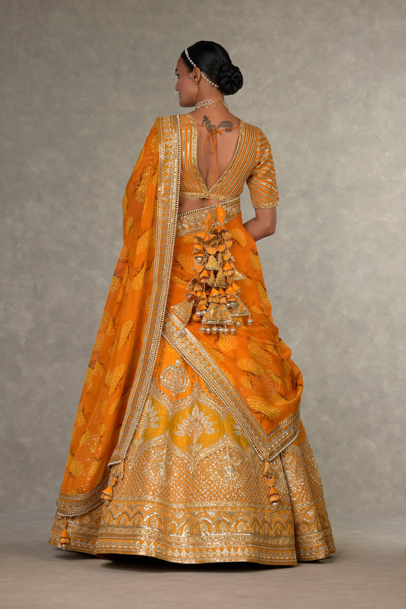 Details: Rust Narangi-Bagh Lehenga - Digital printed patchwork lehenga adorned with Chaand-Phool and Jhaali in gold dori, sitara & moti kaam| Embellished with embroidered border and edged with kinari |Side zip closure | Pocket detail | Comes with a separate Can Can skirt Blouse- Blouse adorned with sitara kaam |'V' neckline|Elbow sleeve |Center back opening with tie-up tassel detail | Printed lining Dupatta- All over digital printed Organza dupatta | Embellished with embroidered border and edged with kinari |Tassel detail