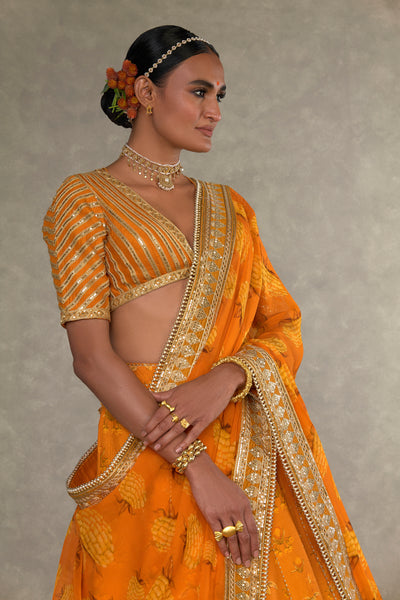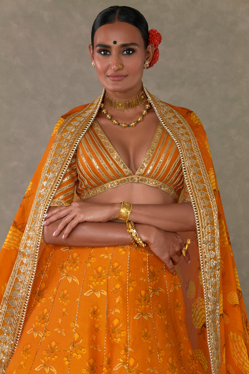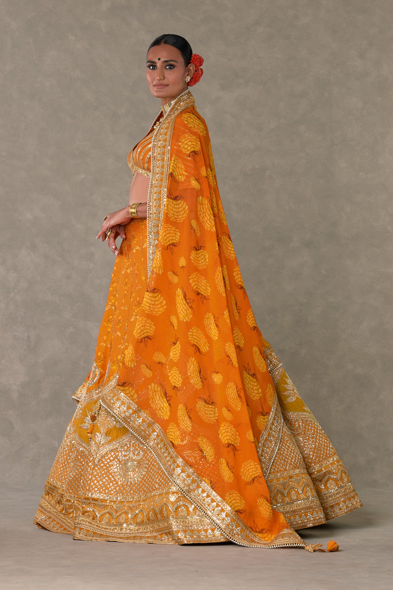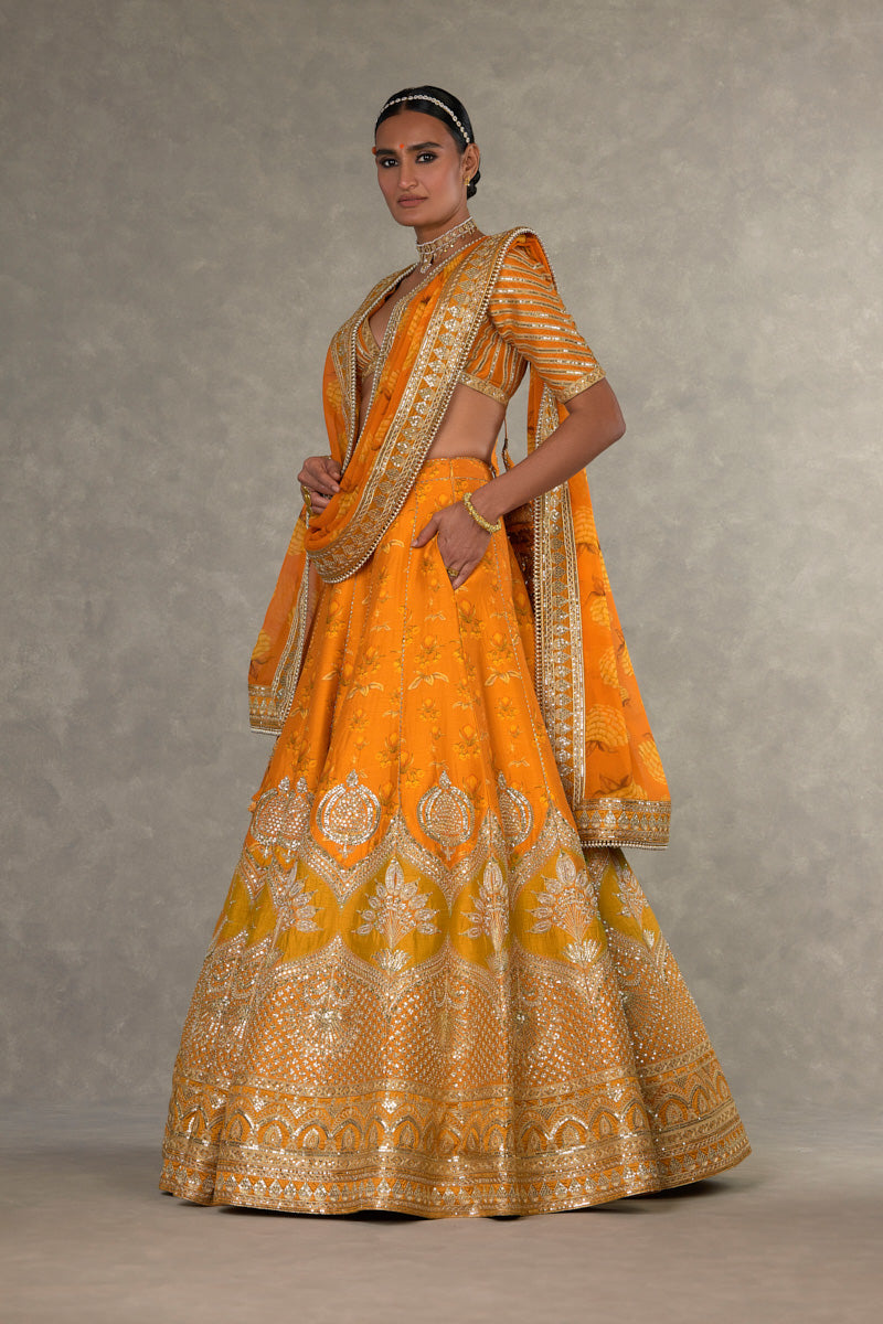 Details: Rust Narangi-Bagh Lehenga - Digital printed patchwork lehenga adorned with Chaand-Phool and Jhaali in gold dori, sitara & moti kaam| Embellished with embroidered border and edged with kinari |Side zip closure | Pocket detail | Comes with a separate Can Can skirt Blouse- Blouse adorned with sitara kaam |'V' neckline|Elbow sleeve |Center back opening with tie-up tassel detail | Printed lining Dupatta- All over digital printed Organza dupatta | Embellished with embroidered border and edged with kinari |Tassel detail