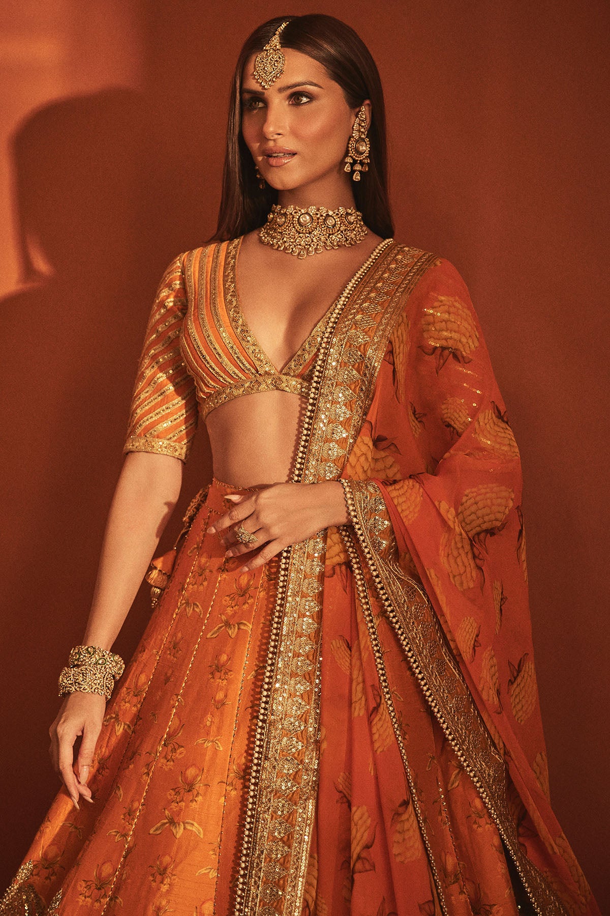 Styling: Pair this Rust Orange Lehenga with statement jewellery and comfortable heels for an elevated look. Style it with our beautiful digital printed organza dupatta draped elegantly over one shoulder for a more elevated look
