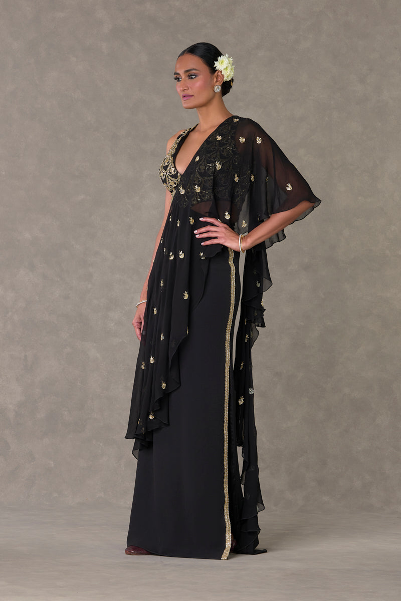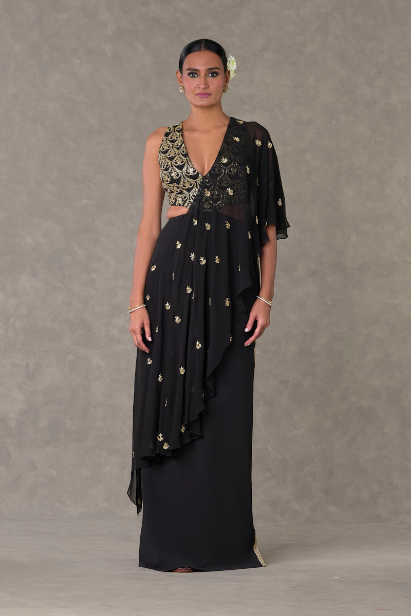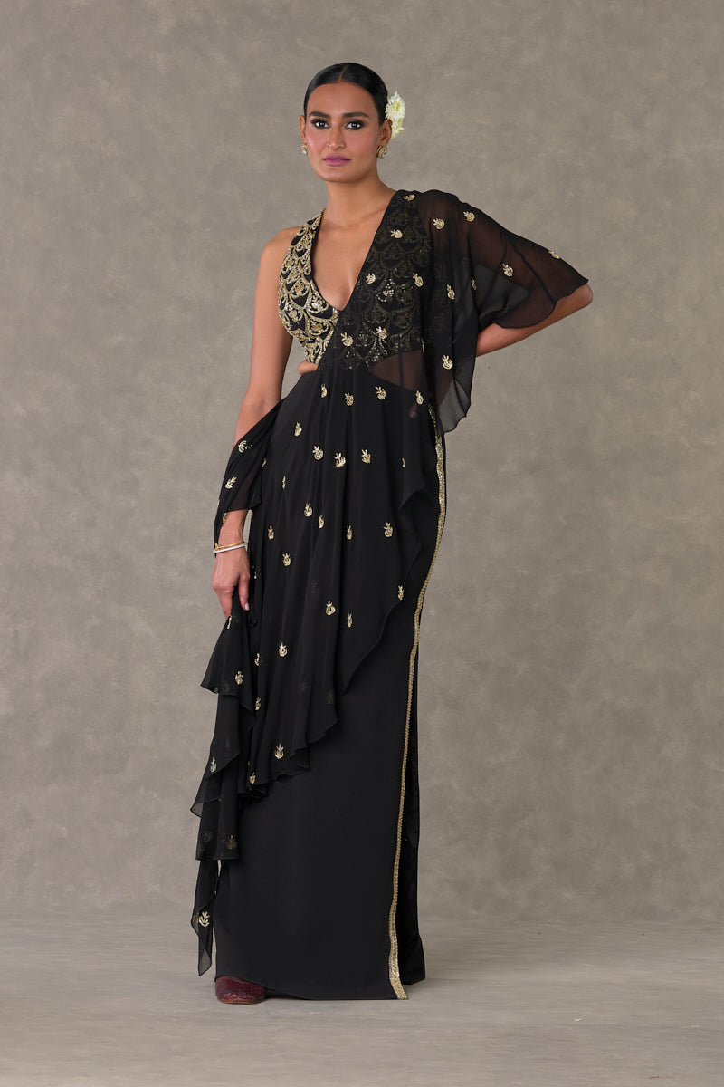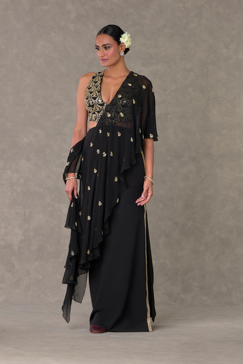 Details: Black Color Saree - 'V' Neck | n-cut sleeves | Cut out gown with attached ruffled palla adorned with pita, dori and sitara kaam| Bodice adorned in our = 'Paan-Phool' jhaal embroidery | Centre back closure