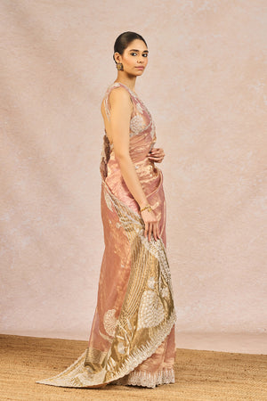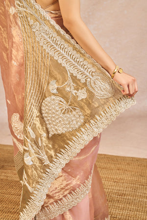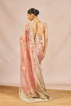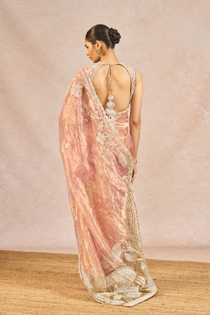 Details: Saree -Blush tissue saree with sage patchwork at pallu end | Silver kaam in dori, sitara and zardozi kaam | Scalloped edge | Print Backing | Signature motifs cascading down from pallu to front body with paan phool and paankh bagh motifs Blouse - V neck sleeveless blouse | Step assymetrical hem | Open back | Back opening | Crystal Tassel