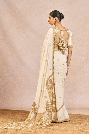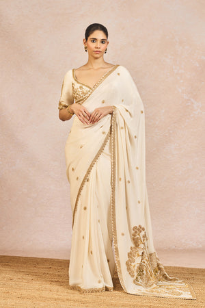 Description: The ‘NAMKEEN’ SAREE beautifully blends traditional artistry and elegant design, featuring intricate Sitara and dori embroidery that highlights ' Gul Jharokha' motif, including exquisite bagh motifs, across the fabric. The pallu stands out with richly embroidered motifs, showcasing exquisite threadwork that adds depth and richness to the design. Complementing the saree is a matching blouse crafted from the same crepe fabric, adorned with delicate gold embroidery on the sleeves and neckline, echoing the saree’s motifs for a cohesive and elegant look. Known for its fluidity and softness, the crepe fabric drapes effortlessly, enhancing the wearer’s silhouette with graceful ease.