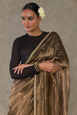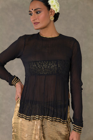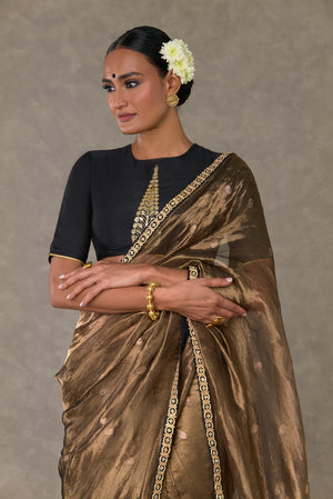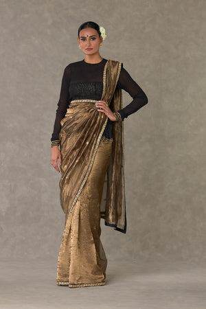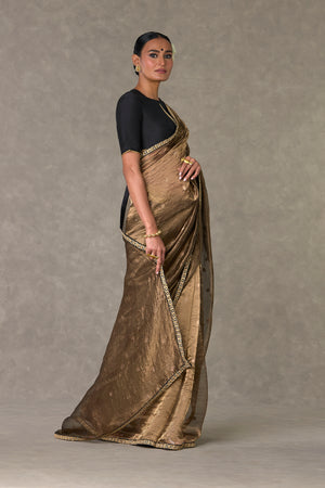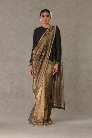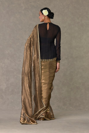 Details: Saree - Black Surma Tissue Saree with zari boondi all over| Embellished with embroidered border Blouse piece - Blouse piece embellished with 'Paan-Patti' in dori and sitara kaam Tube - All over jhaal in dori sitara and dabka kaam |Detachable straps |Centre back closure Kurta - Sheer crushed kurta with gota silai along the hemline| Zero neckline with centre back closure | Churi sleeves