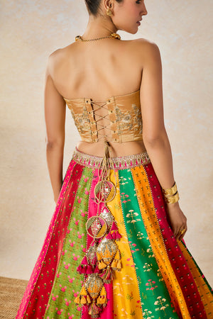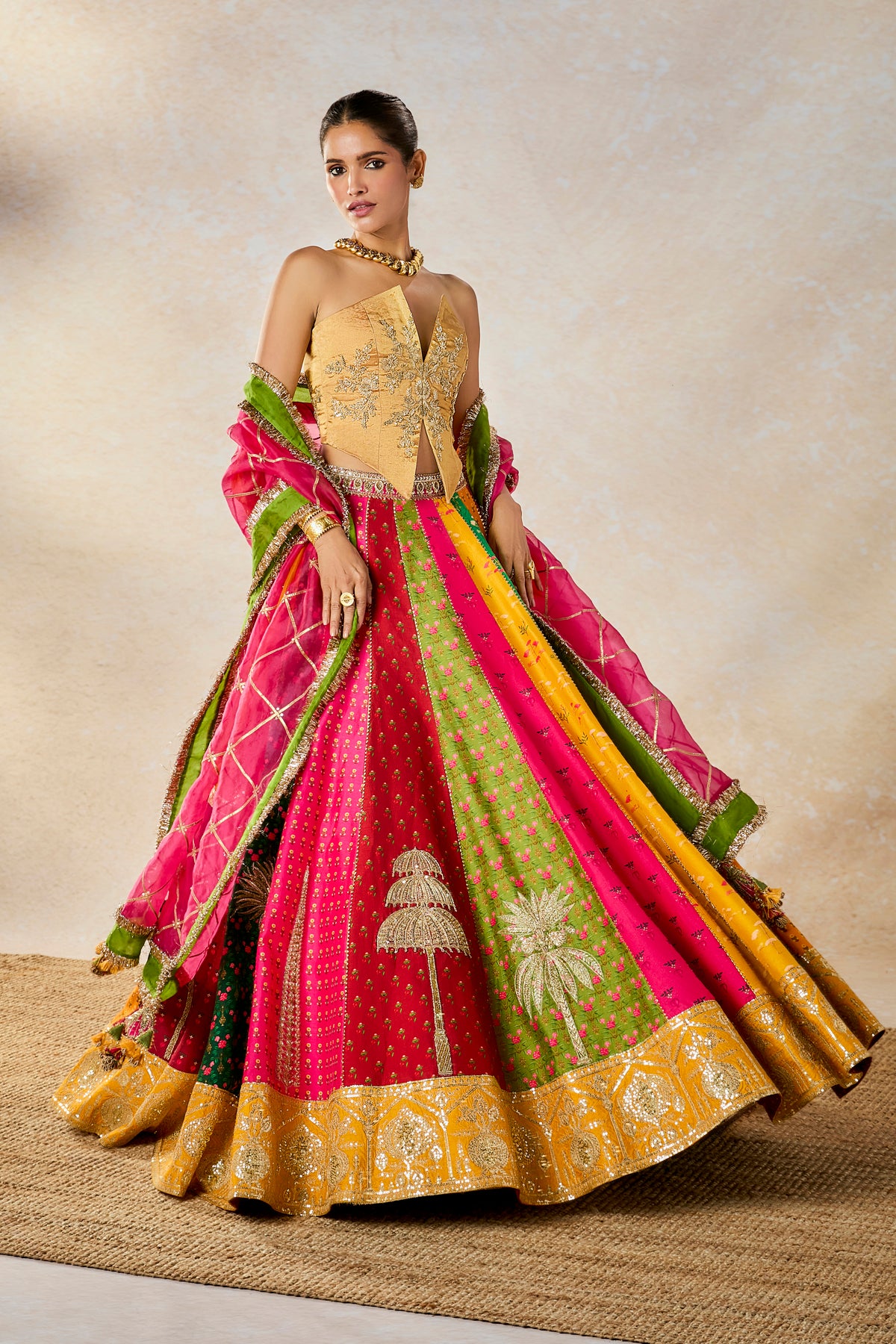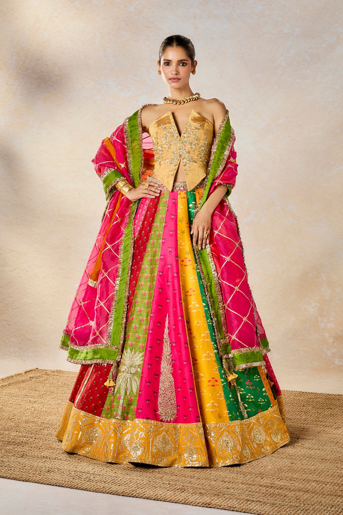 Description:Inspired by the age old craft of patchwork originating from the vibrant rural communities of Kutchch, The Rainbow Barfi lehenga is colorful, vibrant and exuding regality. 10 different prints, 5 different motifs come together to create artistry. Styled with a butterfly style corset blouse designed in tissue and embelished with Dori, dabka & moti kaam. Comes with a separate can can.