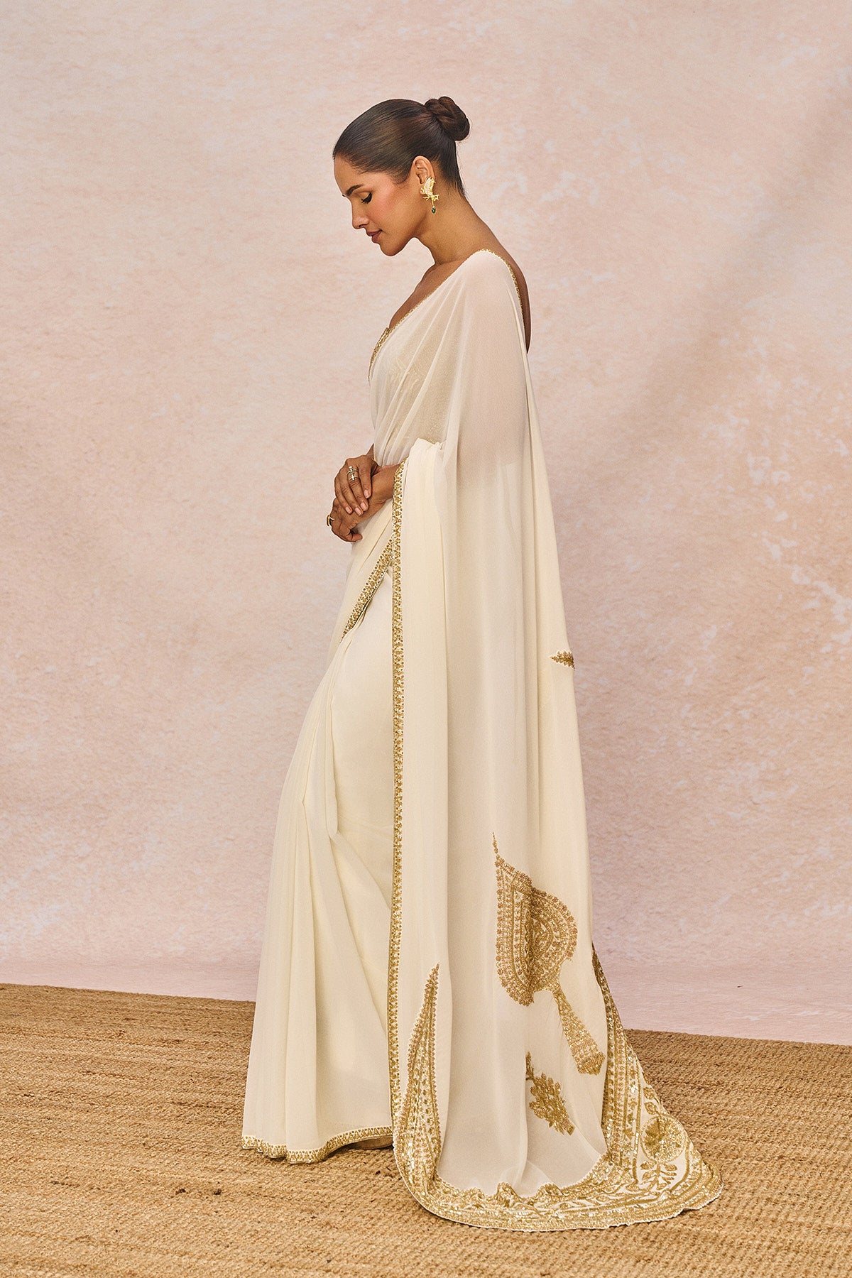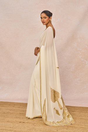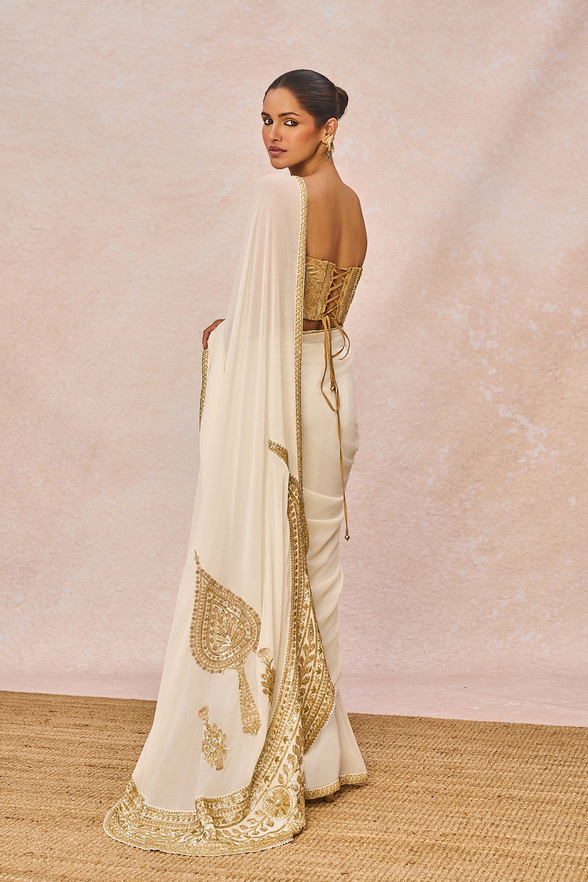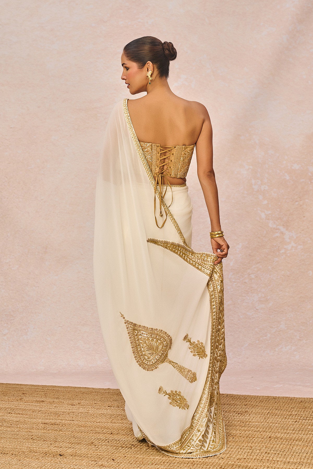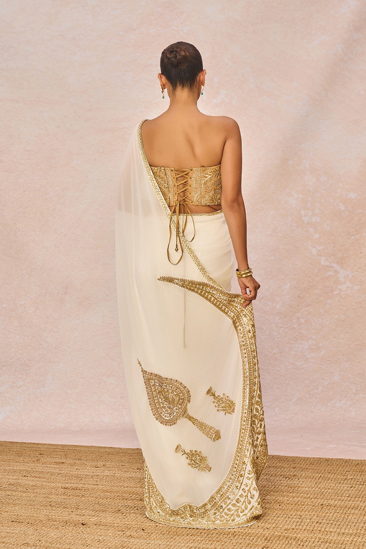 Description: Saree with Corset Blouse- This exquisite saree is adorned with intricate dori and sitara embroidery, artfully showcasing traditional 'chaand' and 'paan' motifs. The palla is gracefully designed in the shape of a crescent moon, adding a celestial elegance to the ensemble. Complementing the saree is a blouse crafted from opulent gold tissue, richly embellished with meticulous hand embroidery, elevating the overall grandeur of the attire. Potli-Completing the look is a statement moon-shaped potli, richly embellished with dori and sitara work, echoing the artistry of the saree and adding a touch of regal finesse to the ensemble.