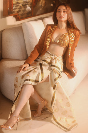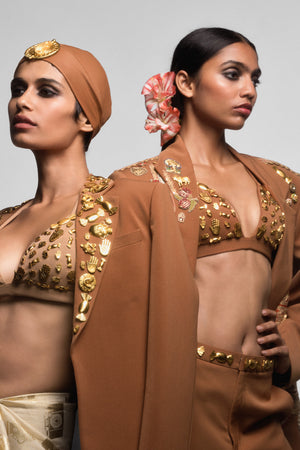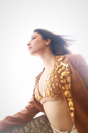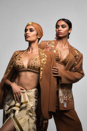Styling: The Tan Trophy blazer can be paired with 'The biscuit bra' and 'The all charmed veshti'.