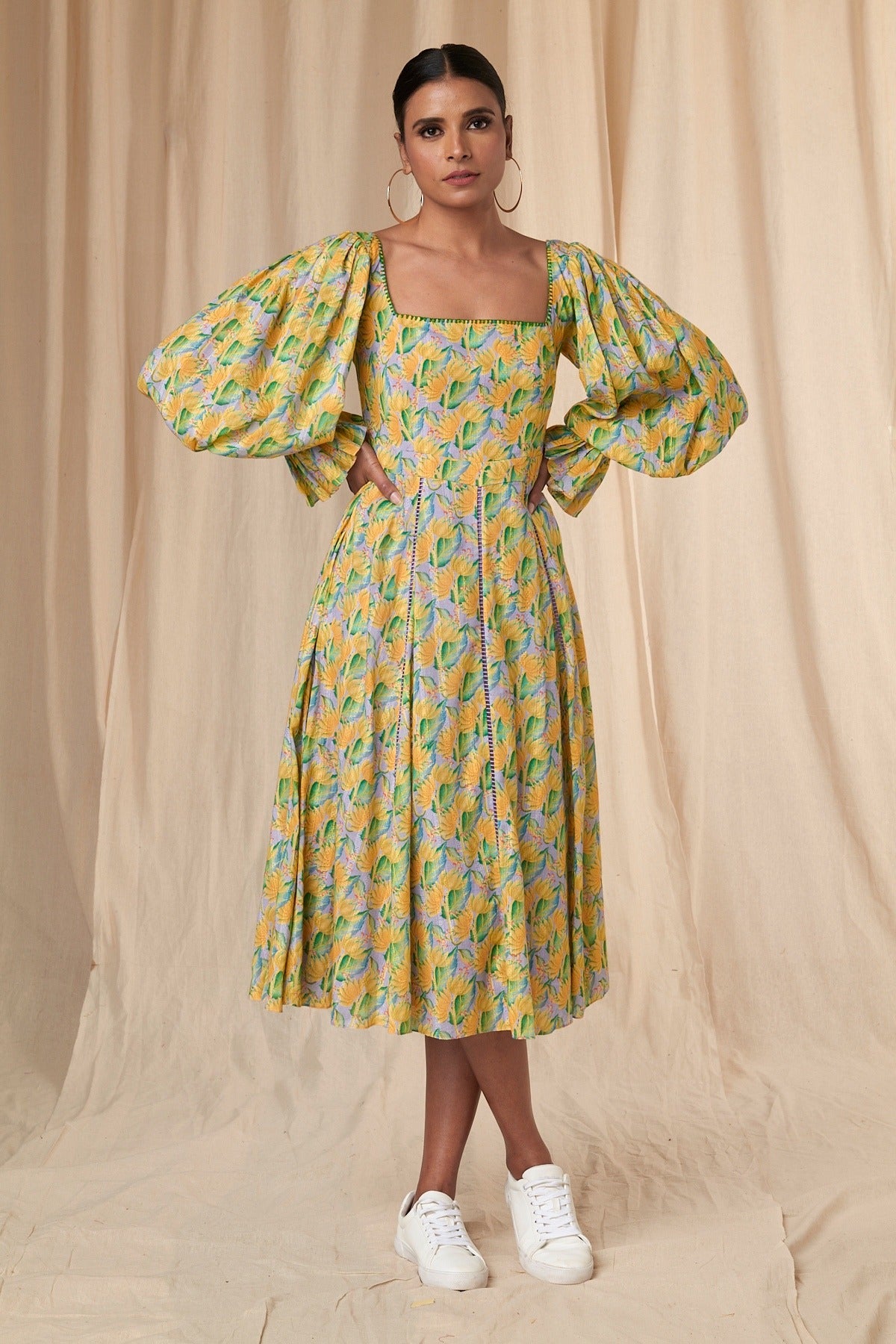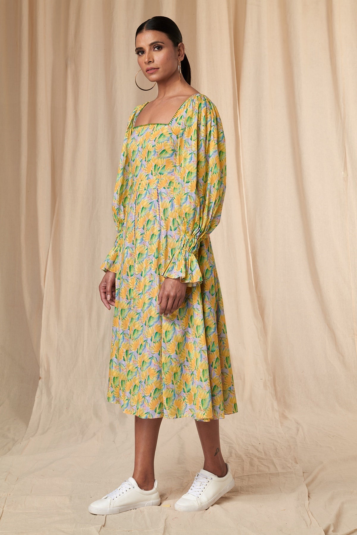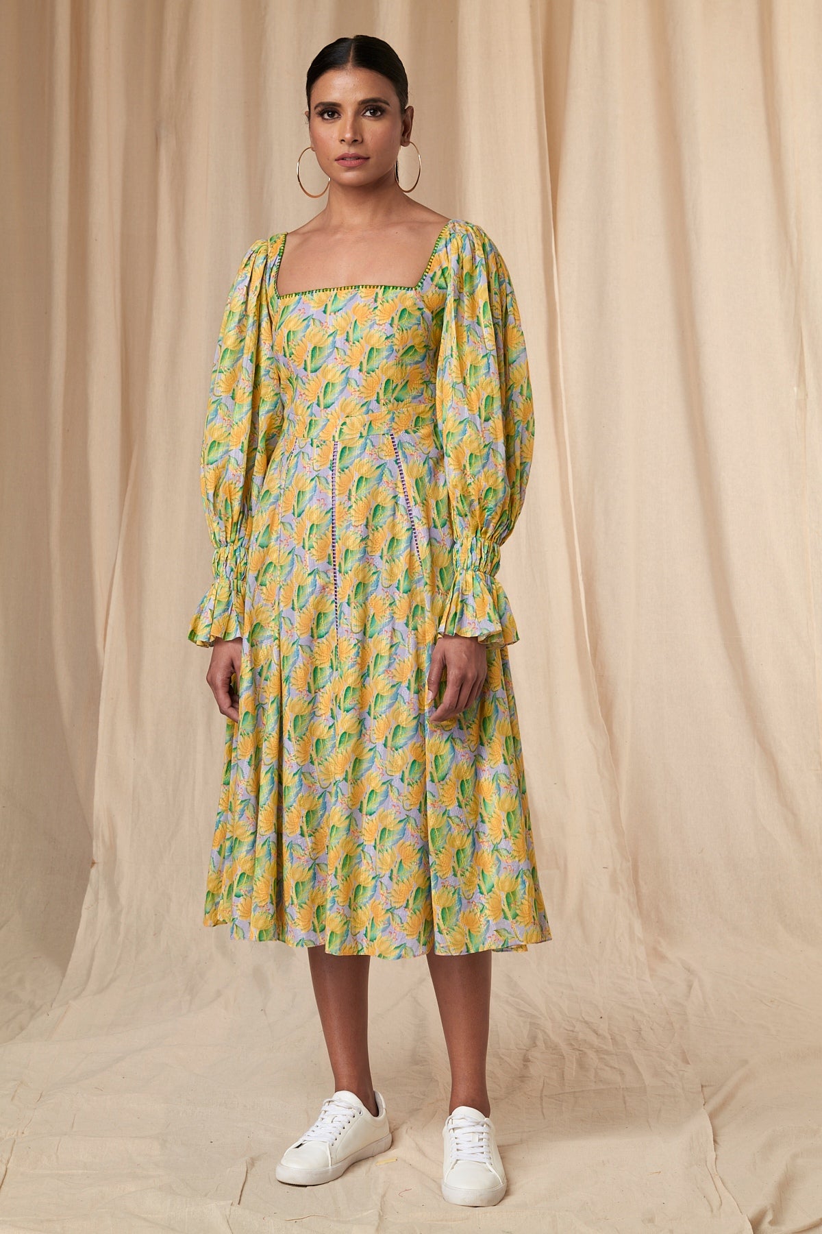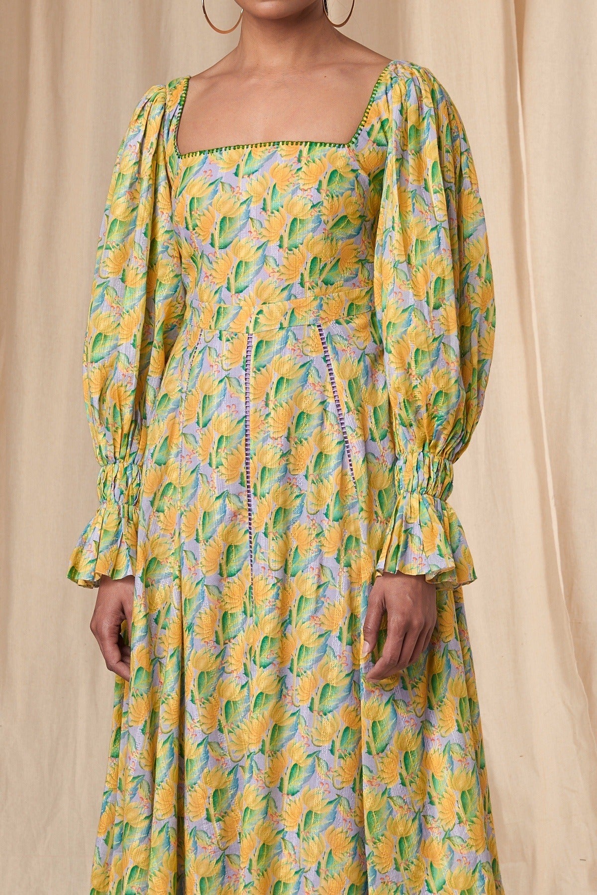 Details: A-line | square neckline | smocked sleeves | frills | blanket stitch | ladder lace