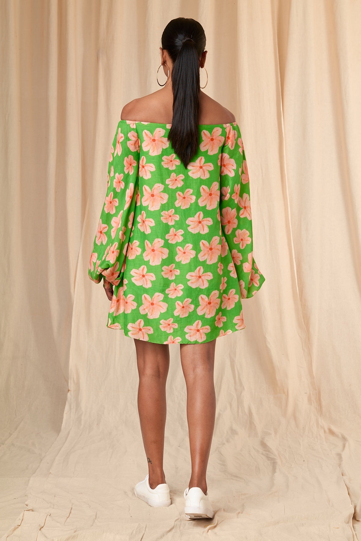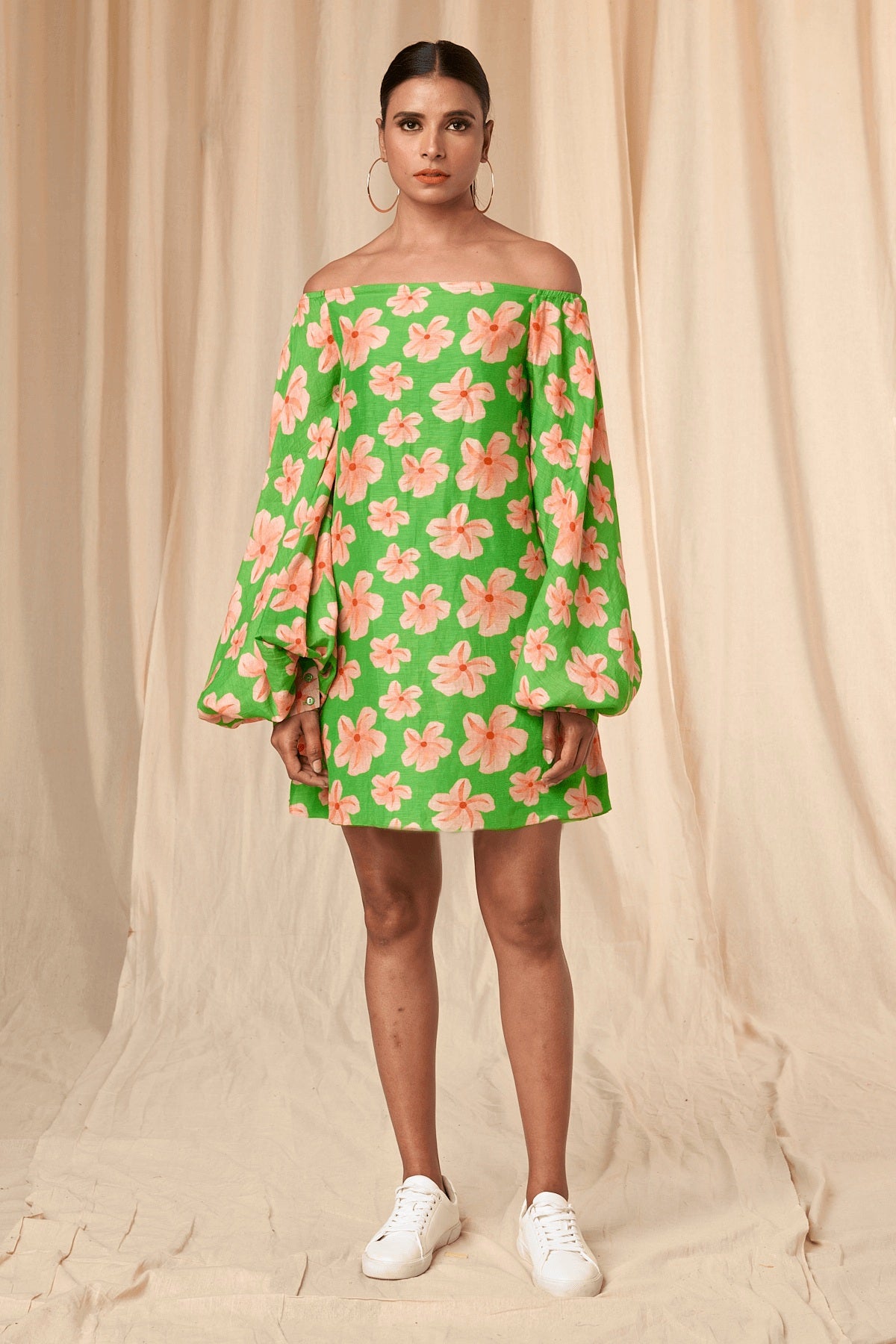 Details: Parrot Green Flower Passion Off Shoulder Dress - Off-the-Shoulder | cuff | balloon Sleeves