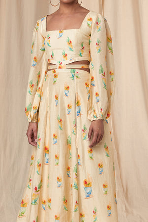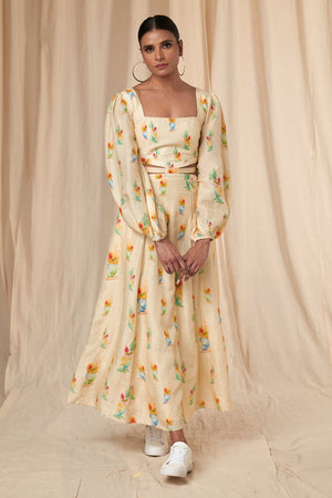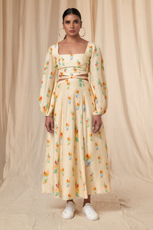 Details: Ivory Rock N Rolll Cut Out Dress - A- Line | Cut-out waist | Square Neck | Puff Sleeves | Elasticated Wrist band | Hand embroidered Blanket Stitch Neckline | Pockets