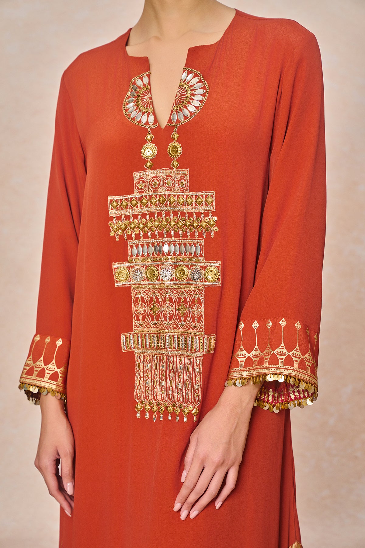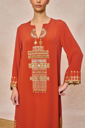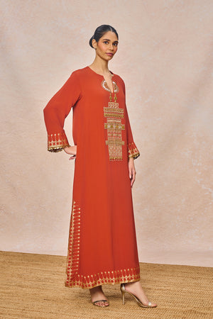 Details: A timeless rust kaftan, featuring intricate hand embroidery at the front. Side slits are accented with a foil border and delicate coin detailing, adding subtle shimmer and artisanal charm to the silhouette.