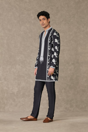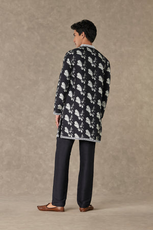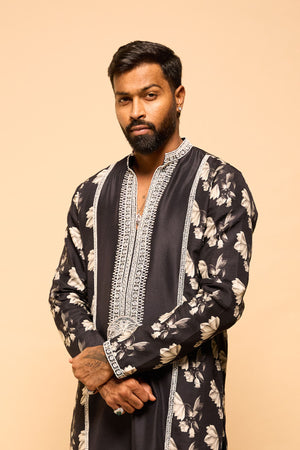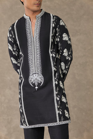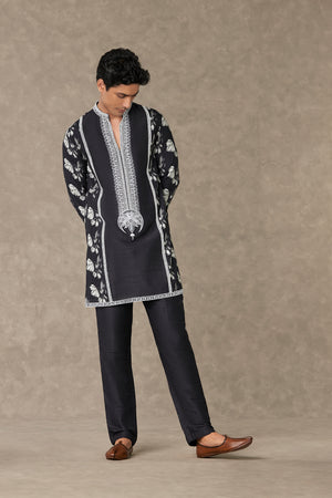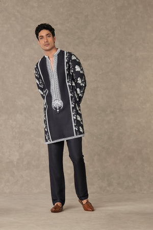 Details: Black Chaand Kurta Set - Kurta with contrast dori, sitara and moti kaam around the neckline | All over digital printed sleeves, back and side panel | Full sleeves with contrast embroidered border| Mandarin Collar | Pocket detail Pant- Straight pant with pocket detailing