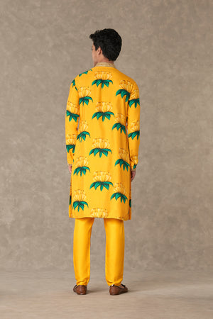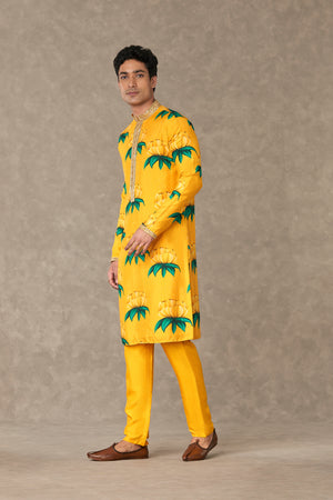Details: Mustard Masakali Set - Digital placement printed Bandi | Mandarin collar embellished with embroidered border | Concealed placket |Center front opening |Printed lining Kurta- All over digital printed kurta with full sleeves |Collar, placket and sleeve hem embellished with border |Pocket detail|Concealed placket|Mandarin collar Pant- Straight pants with pocket.