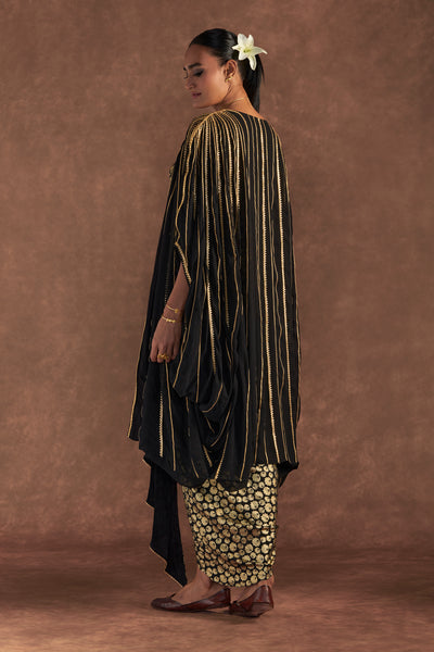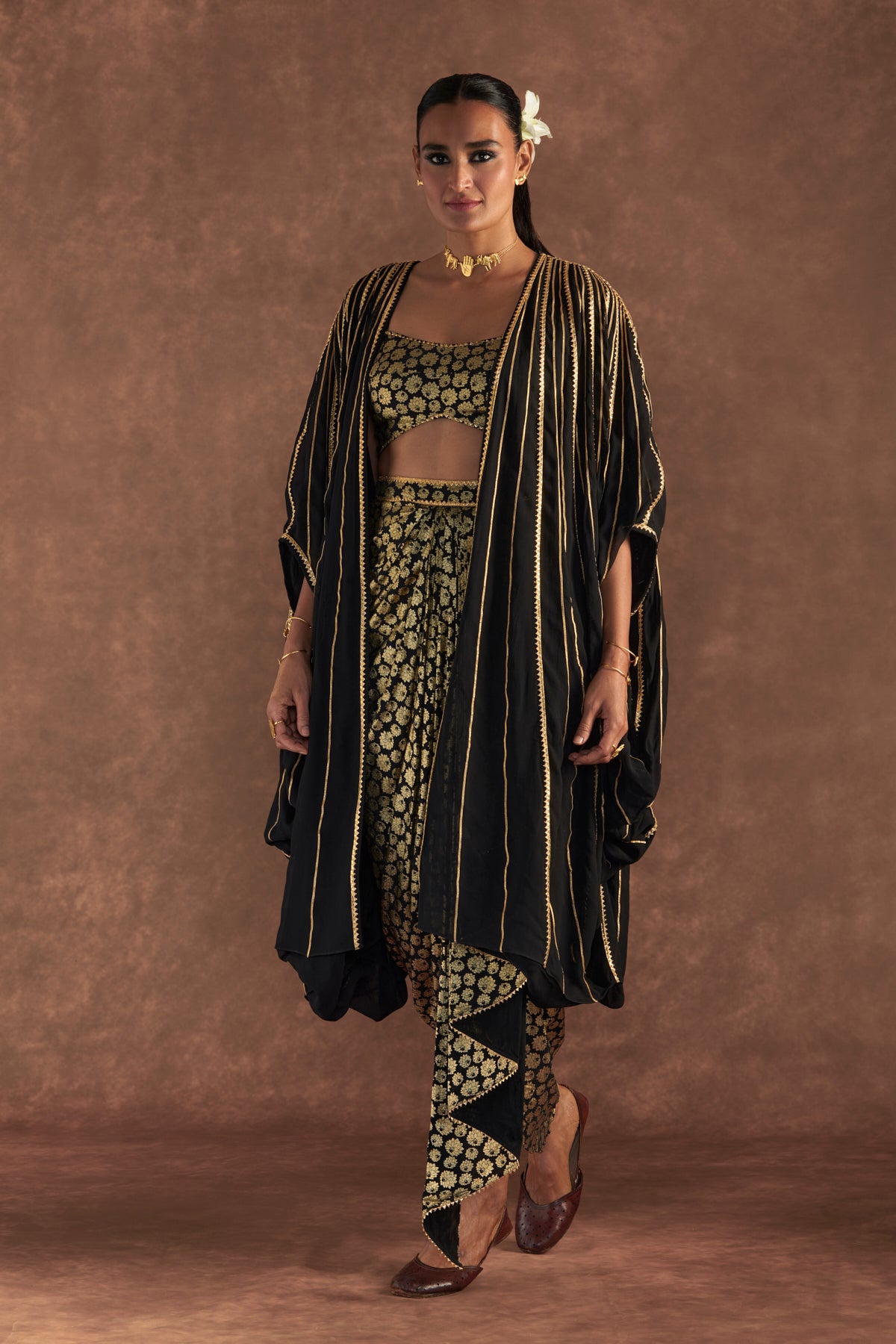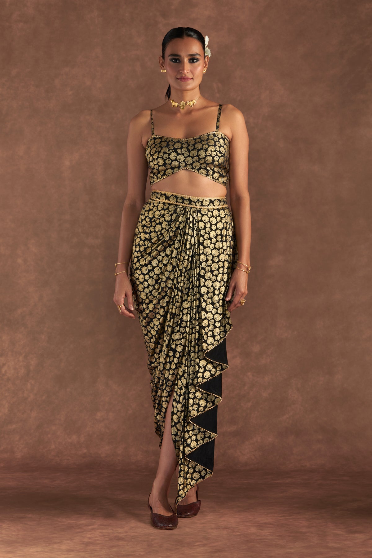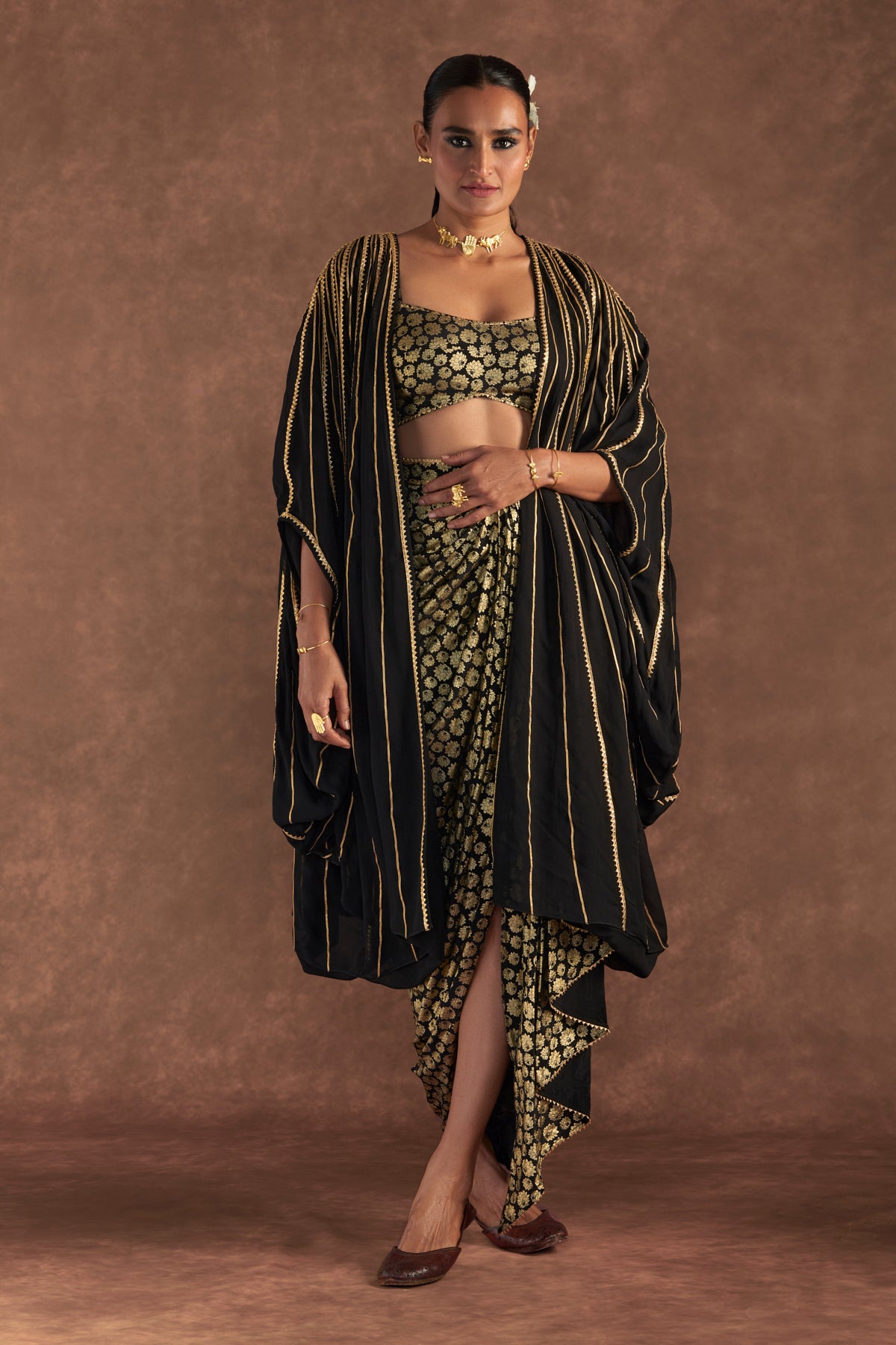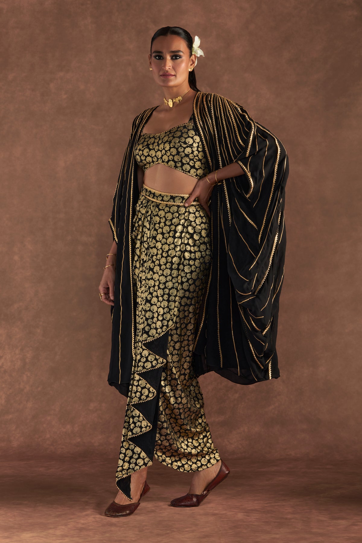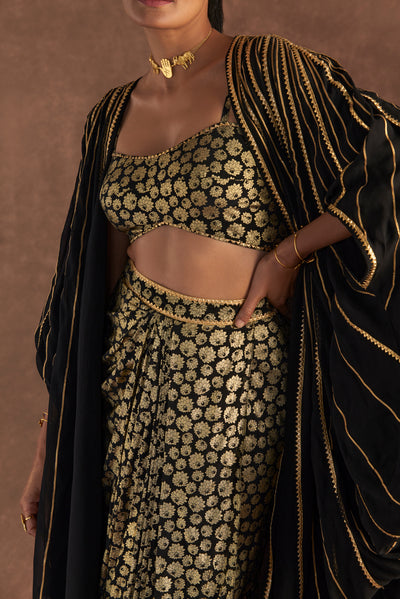 Details: Black Berrybloom Drape Skirt Set - All over foil printed bustier & drape skirt edged with kinari | Cowl Cape with gota & kinari detailing