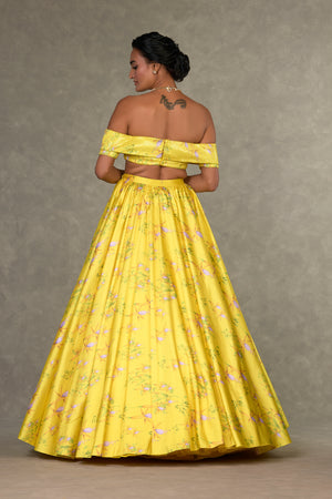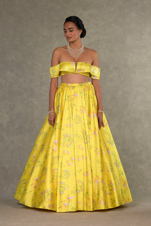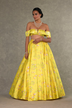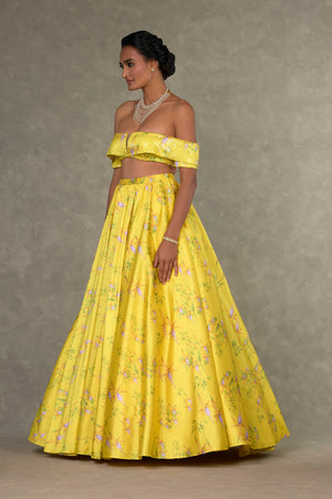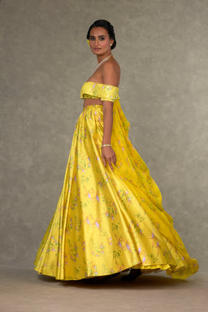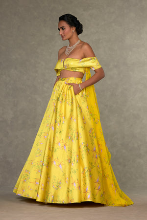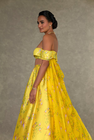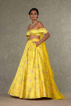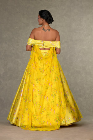 Details: Lemon pleated skirt - All over digital printed skirt |Circular skirt with light gathers around the waist | Side zip closure | Pocket detail |Comes with a separate can can skirt. Busteir- All over digital printed off- shoulder bustier with sequin sheeting |Cape sleeve| Printed lining |Centre back closure with detachable cowl cape
