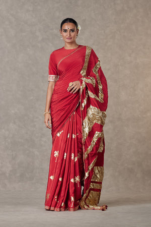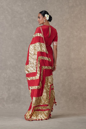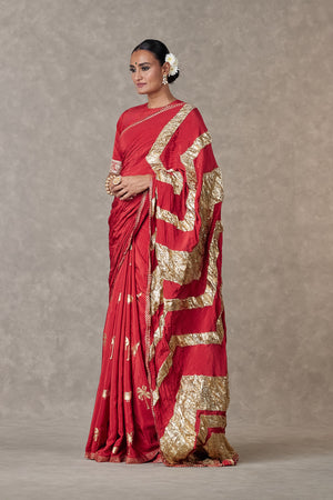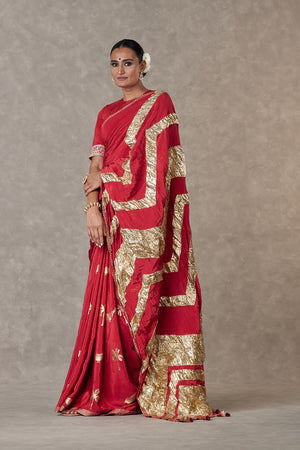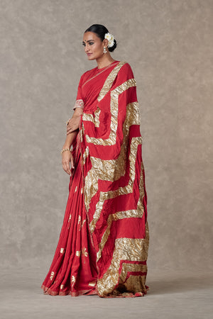 Details: This Maroon Vintage Fiona Gota Sareeis an ode to our very famous gota saree. It has a crushed Pallu which is embellished with thick gota borders and edged with Pinstriped band. It comes with a maroon coloured blouse piece.
