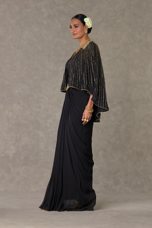 Details: Black Drape Skirt - Tube with Center back closure | Detachable straps Drape Skirt- Drape skirt with 'V' shaped waistbelt | Waistbelt embroidered with dori & Sitara kaam | Centre back closure Cape- Front Open cape with 'Neel Kamal' motif embroidered with dori, sitara & dabka work | Edged with Kinari