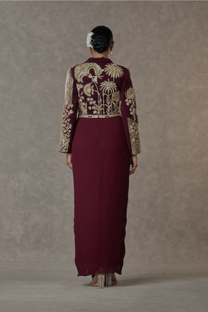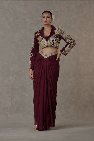 Details: Blazer - Son-Chidiya Cropped blazer embroidered with moti, dori & sitara kaam |Full sleeve | Notch collar | Centre front closure Drape Skirt - Drape skirt with 'V' shaped waist belt| Waist belt embroidered with dori & sitara kaam| Centre back closure Tube - Ivory fitted tube with Center back closure | Comes with detachable strap