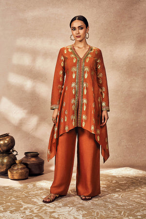 Details: Tunic- Beautiful foil printed asymmetrical tunic | Adorned with embroidered borders around neckline and sleeves | 'V' neckline | Full Sleeves | Side seam closure Pant- Rust straight pants | Side seam closure