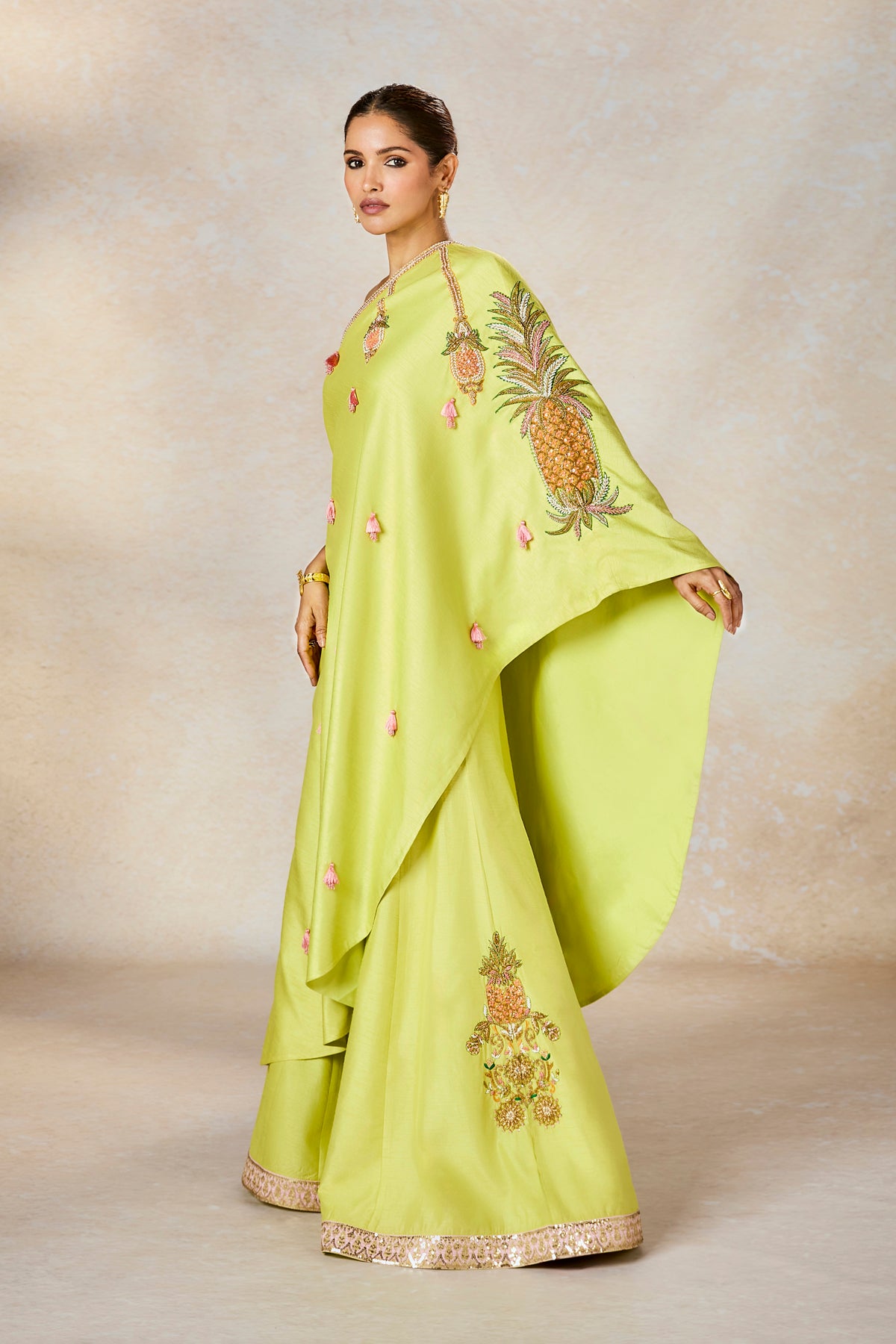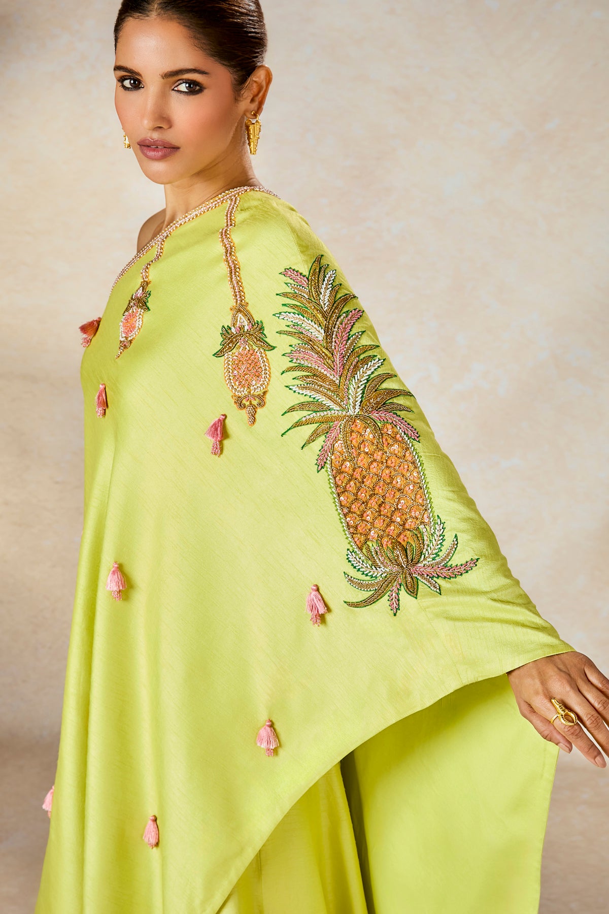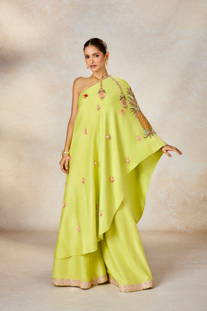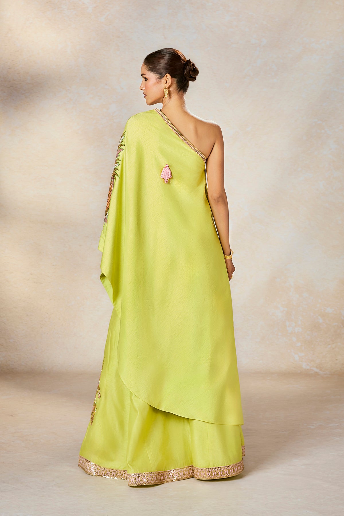 Description:Introducing The Pista Khulfi One Shoulder Set, a fusion outfit that blends traditional artistry with contemporary style. Inspired by our iconic 'Anasam Phool' motifs mixed with unique florals which are brought to life in colorful Resham dhaaga, sitara embroidery and beautiful tassels. The ensemble is completed with an embroidered sharara. The Pista Kulfi One Shoulder Set is perfect for those who seek to make a statement with timeless elegance and a touch of whimsy, ideal for weddings, festive occasions, or any event where you wish to stand out with grace and charm."
