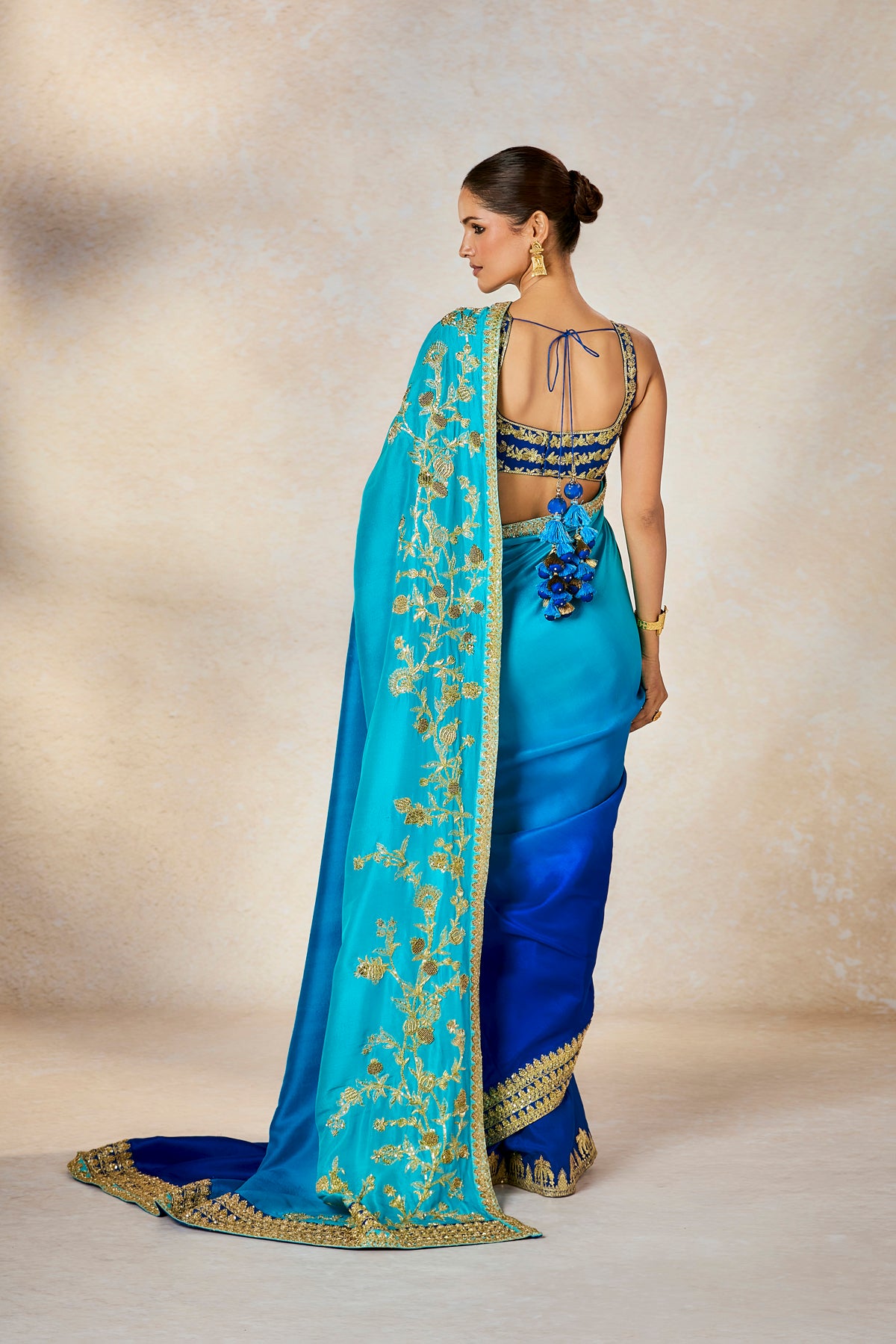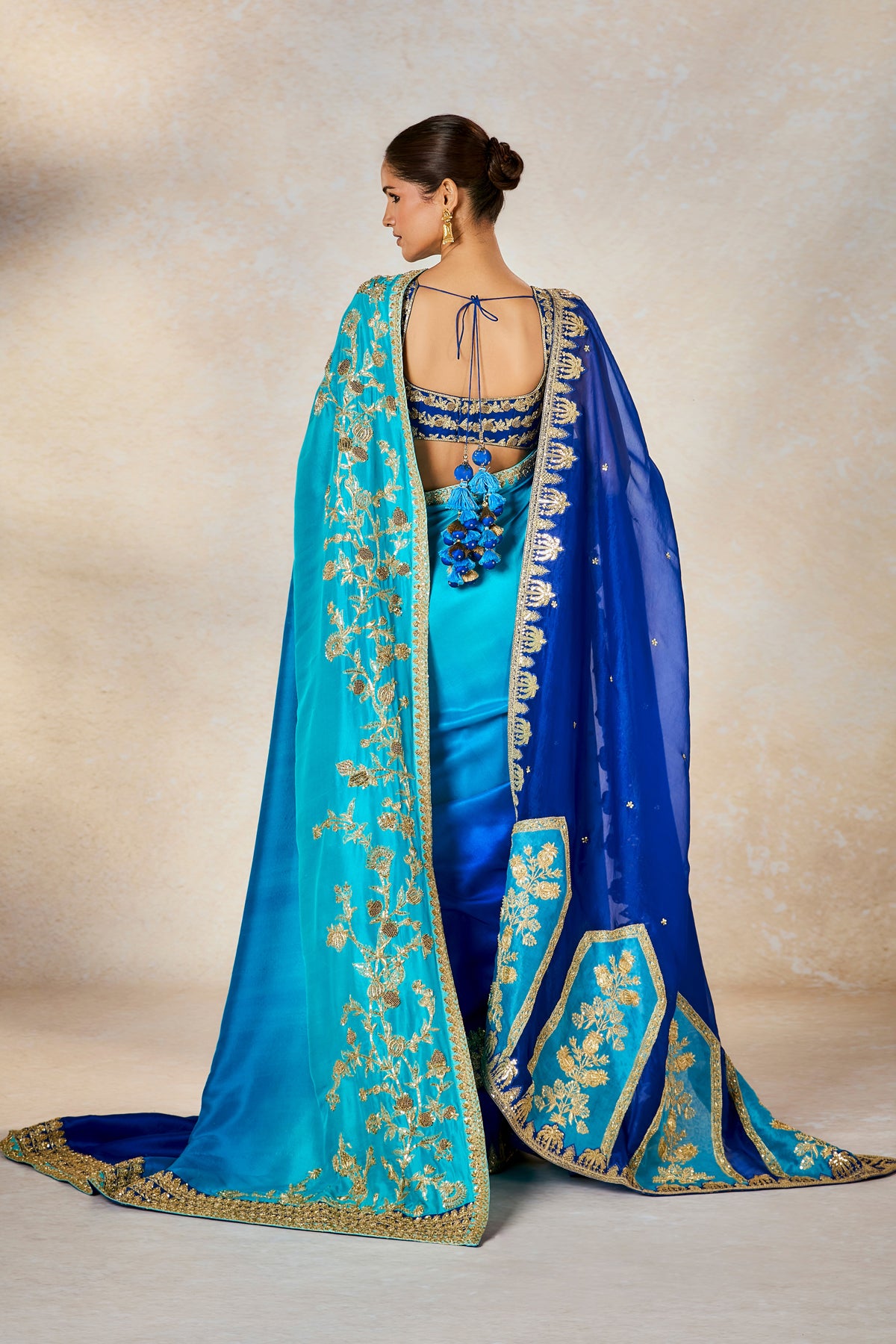 Description:A Poetic drape in vivid blue, The Sanjh saree encapsulates the eccentric aesthetic of the brand in all its zany ways. This ornate ombre saree in hues of the sky has an intricate border on all sides accentuated with an anar jaal. With color block pleats and and a hero motif adding to its beauty, this saree is for the woman who finds her spot at every occassion. The dupatta has patchwork detailing with ornate embroidery.