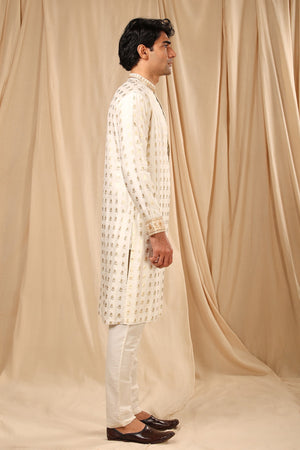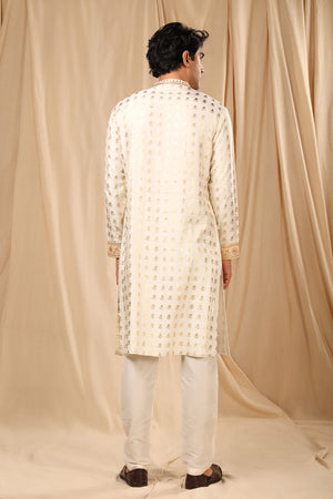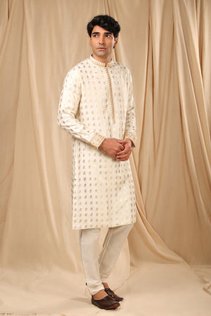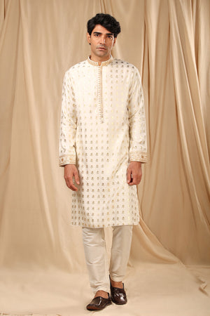 Details: Ivory Wallflower Raw Silk Kurta comes with Mandarin Collar and Placket embellished with embroidered border to dazzle at special occasion!
