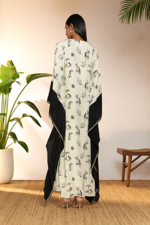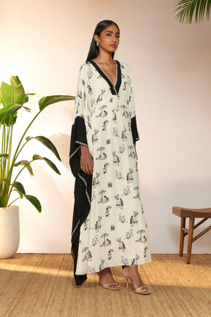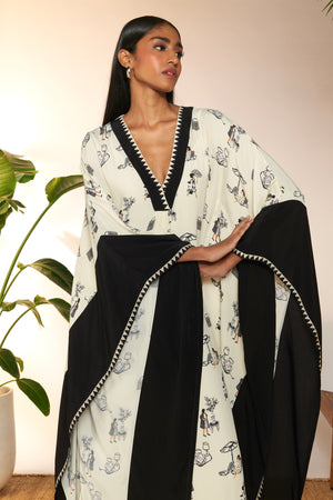 Details: Ivory Jam & Toast Contrast Kaftan - Mid-length kaftan with slip | Black contrast with border detail along the neckline and sleeve hem